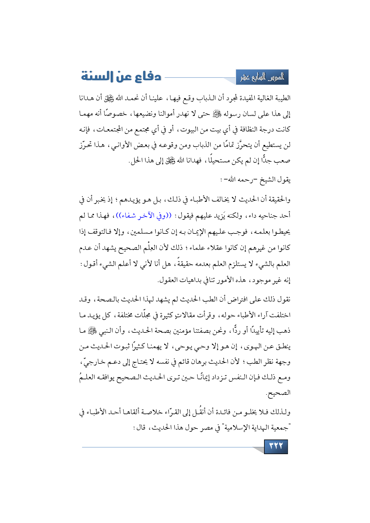 نقول ذلك على افتراض أن الطب الحديث لم يشهد لهذا الحديث بالصحة، وقد اختلفت آراء الأطباء حوله، وقرأت مقالاتٍ كثيرة في مجلّات مختلفة، كل يؤيد ما ذهب إليه تأييدًا أو ردًّا، ونحن بصفتنا مؤمنين بصحة الحديث، وأن النبي -صلى الله عليه وسلم- ما ينطق عن الهوى، إن هو إلا وحي يوحى، لا يهمنا كثيرًا ثبوت الحديث من وجهة نظر الطب؛ لأن الحديث برهان قائم في نفسه لا يحتاج إلى دعم خارجيّ، ومع ذلك فإن النفس تزداد إيمانًا حين ترى الحديث الصحيح يوافقه العلمُ الصحيح.