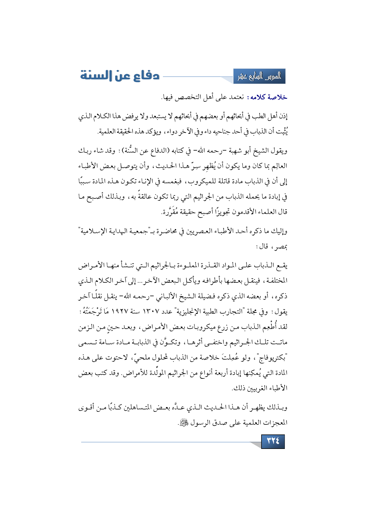 يقع الذباب على المواد القذرة المملوءة بالجراثيم التي تنشأ منها الأمراض المختلفة، فينقل بعضها بأطرافه ويأكل البعض الآخر ... إلى آخر الكلام الذي ذكره، أو بعضه الذي ذكره فضيلة الشيخ الألباني -رحمه الله- ينقل نقلًا آخر يقول: وفي مجلة "التجارب الطبية الإنجليزية" عدد 1307 سنة 1927 مَا تَرْجَمَتُهُ: لقد أُطْعِم الذباب من زرع ميكروبات بعض الأمراض، وبعد حينٍ من الزمن ماتت تلك الجراثيم واختفى أثرها، وتكوَّن في الذبابة مادة سامة تسمى "بكتريوفاج"، ولو عُمِلتَ خلاصة من الذباب لمحلول ملحيّ، لاحتوت على هذه المادة التي يُمكِنها إبادة أربعة أنواع من الجراثيم المولِّدة للأمراض. وقد كتب بعض الأطباء الغربيين ذلك.