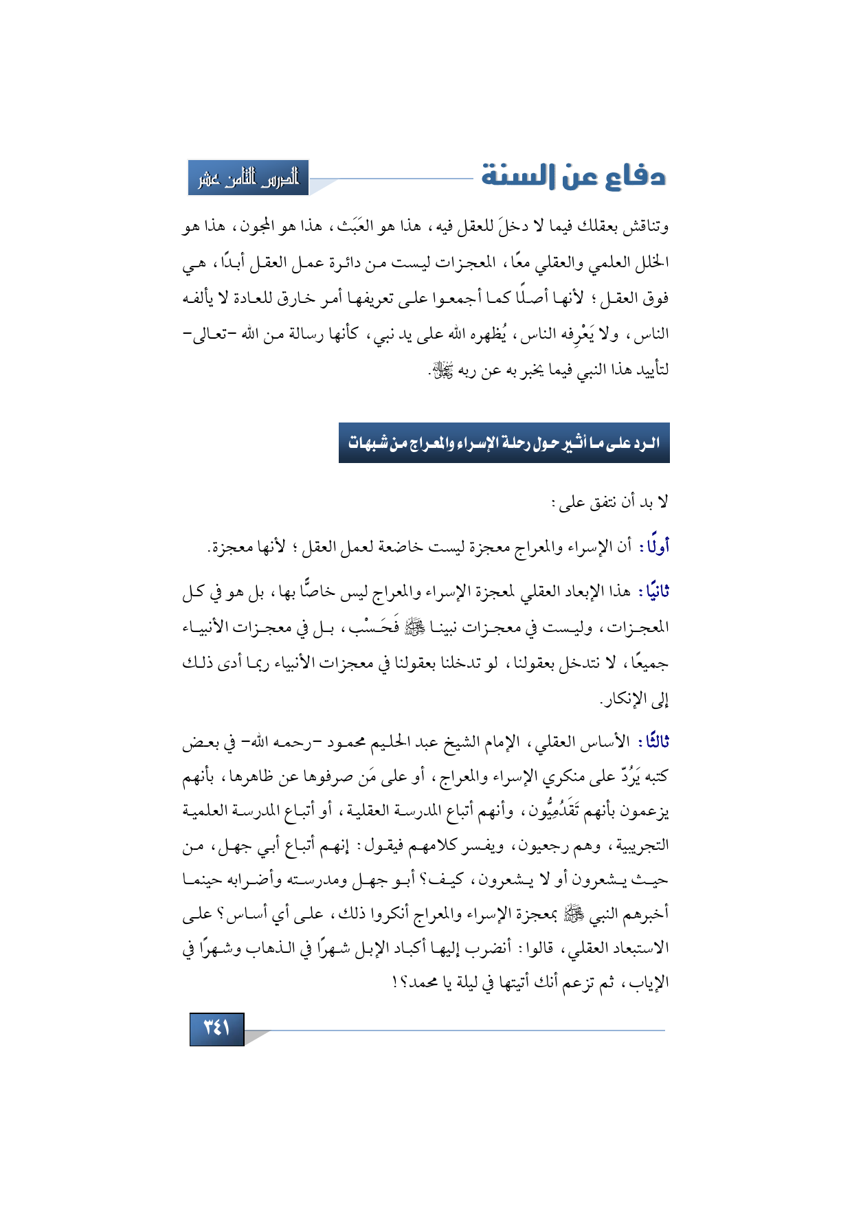 ثالثًا: الأساس العقلي، الإمام الشيخ عبد الحليم محمود -رحمه الله- في بعض كتبه يَرُدّ على منكري الإسراء والمعراج، أو على مَن صرفوها عن ظاهرها، بأنهم يزعمون بأنهم تَقَدُمِيُّون، وأنهم أتباع المدرسة العقلية، أو أتباع المدرسة العلمية التجريبية، وهم رجعيون، ويفسر كلامهم فيقول: إنهم أتباع أبي جهل، من حيث يشعرون أو لا يشعرون، كيف؟ أبو جهل ومدرسته وأضرابه حينما أخبرهم النبي -صلى الله عليه وسلم- بمعجزة الإسراء والمعراج أنكروا ذلك، على أي أساس؟ على الاستبعاد العقلي، قالوا: أنضرب إليها أكباد الإبل شهرًا في الذهاب وشهرًا في الإياب، ثم تزعم أنك أتيتها في ليلة يا محمد؟!