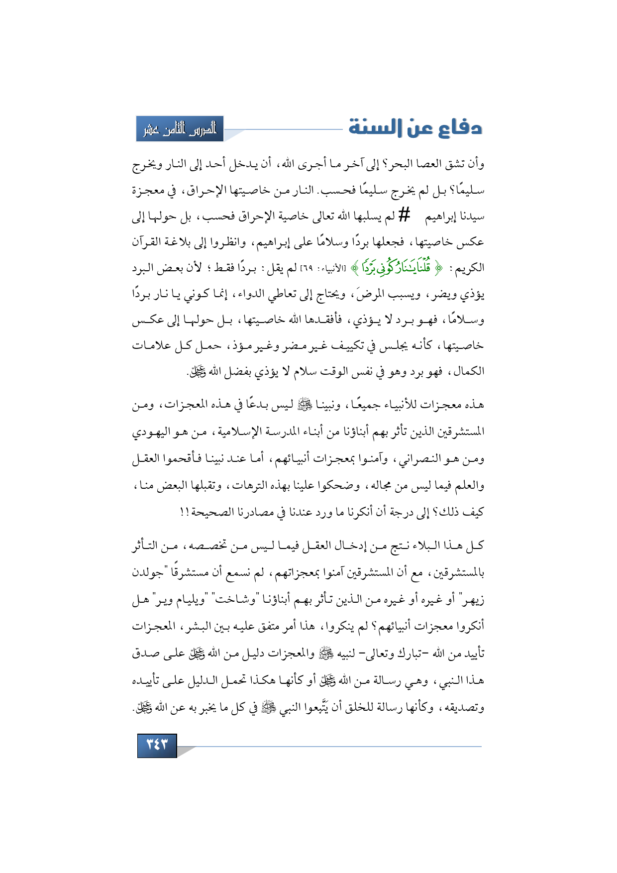 وأن تشق العصا البحر؟ إلى آخر ما أجرى الله، أن يدخل أحد إلى النار ويخرج سليمًا؟ بل لم يخرج سليمًا فحسب. النار من خاصيتها الإحراق، في معجزة سيدنا إبراهيم -عليه السلام- لم يسلبها الله تعالى خاصية الإحراق فحسب، بل حولها إلى عكس خاصيتها، فجعلها بردًا وسلامًا على إبراهيم، وانظروا إلى بلاغة القرآن الكريم: {قُلْنَا يَا نَارُ كُونِي بَرْدًا} (الأنبياء: 69) لم يقل: بردًا فقط؛ لأن بعض البرد يؤذي ويضر، ويسبب المرضَ، ويحتاج إلى تعاطي الدواء، إنما كوني يا نار بردًا وسلامًا، فهو برد لا يؤذي، فأفقدها الله خاصيتها، بل حولها إلى عكس خاصيتها، كأنه يجلس في تكييف غير مضر وغير مؤذ، حمل كل علامات الكمال، فهو برد وهو في نفس الوقت سلام لا يؤذي بفضل الله -عز وجل-.