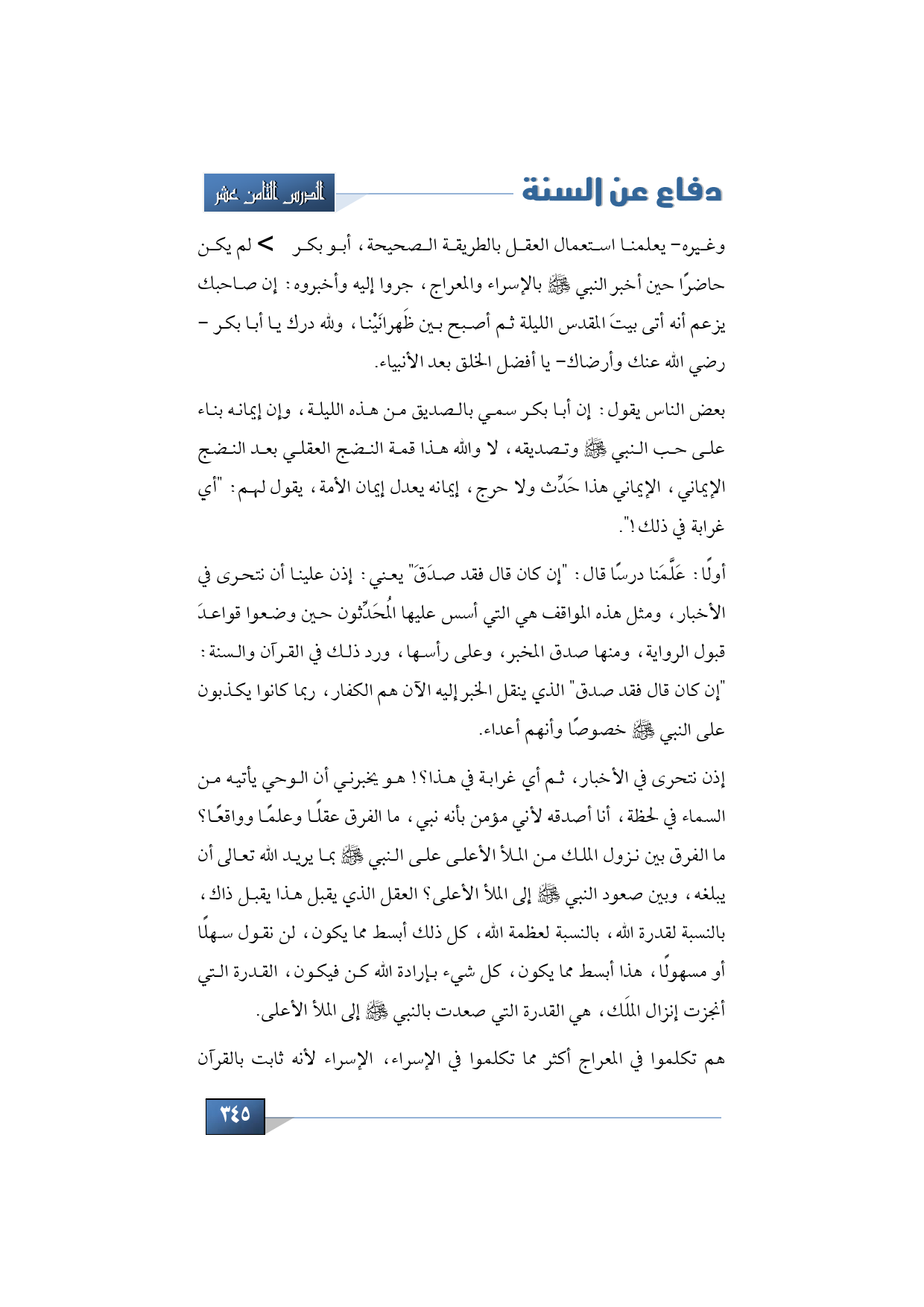 وغيره- يعلمنا استعمال العقل بالطريقة الصحيحة، أبو بكر -رضي الله عنه- لم يكن حاضرًا حين أخبر النبي -صلى الله عليه وسلم- بالإسراء والمعراج، جروا إليه وأخبروه: إن صاحبك يزعم أنه أتى بيتَ المقدس الليلة ثم أصبح بين ظَهرانَيْنا، ولله درك يا أبا بكر -رضي الله عنك وأرضاك- يا أفضل الخلق بعد الأنبياء.