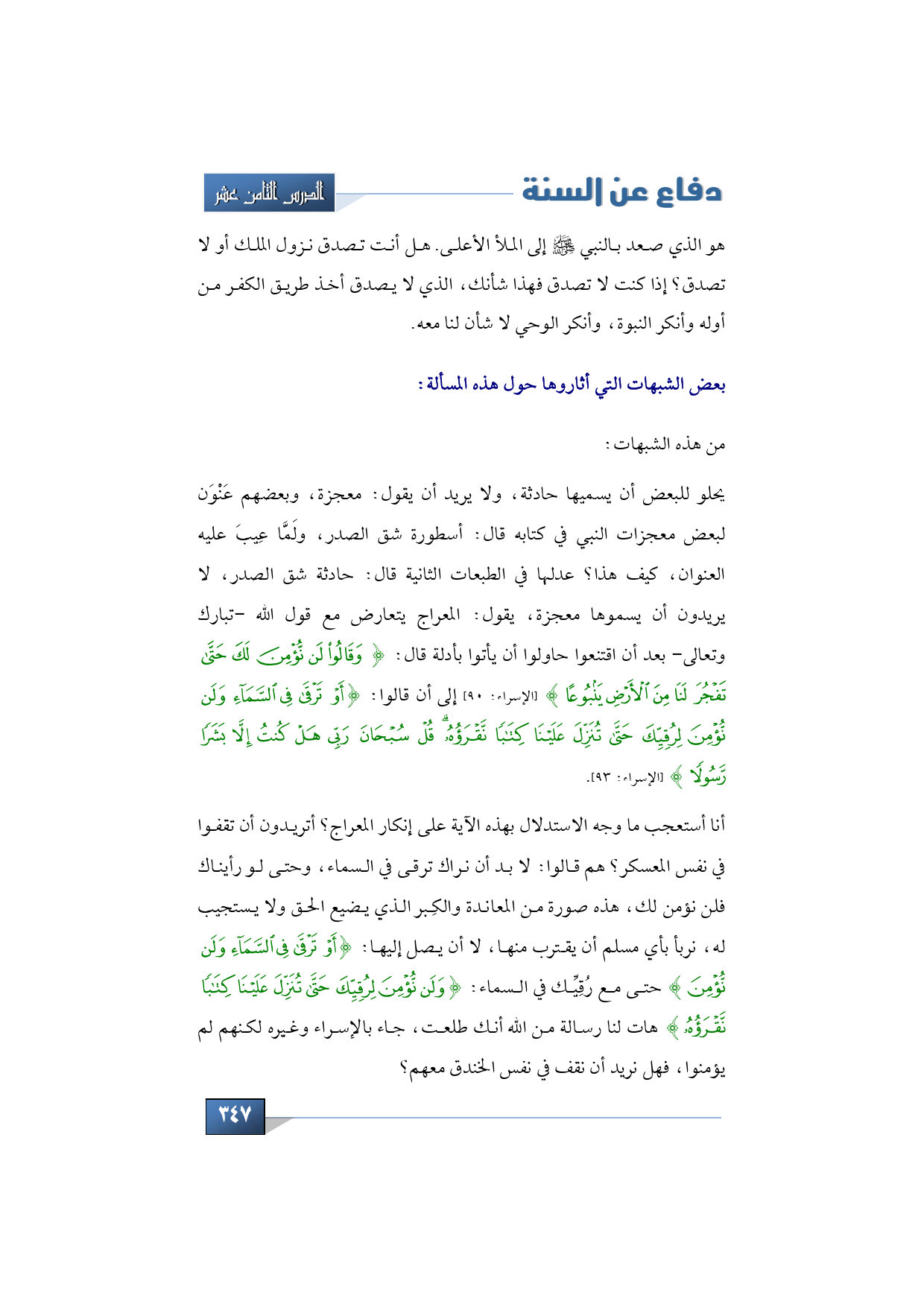 أنا أستعجب ما وجه الاستدلال بهذه الآية على إنكار المعراج؟ أتريدون أن تقفوا في نفس المعسكر؟ هم قالوا: لا بد أن نراك ترقى في السماء، وحتى لو رأيناك فلن نؤمن لك، هذه صورة من المعاندة والكِبر الذي يضيع الحق ولا يستجيب له، نربأ بأي مسلم أن يقترب منها، لا أن يصل إليها: {أَوْ تَرْقَى فِي السَّمَاءِ وَلَنْ نُؤْمِنَ} حتى مع رُقِيِّك في السماء: {لَنْ نُؤْمِنَ لِرُقِيِّكَ حَتَّى تُنَزِّلَ عَلَيْنَا كِتَابًا نَقْرَؤُهُ} هات لنا رسالة من الله أنك طلعت، جاء بالإسراء وغيره لكنهم لم يؤمنوا، فهل نريد أن نقف في نفس الخندق معهم؟