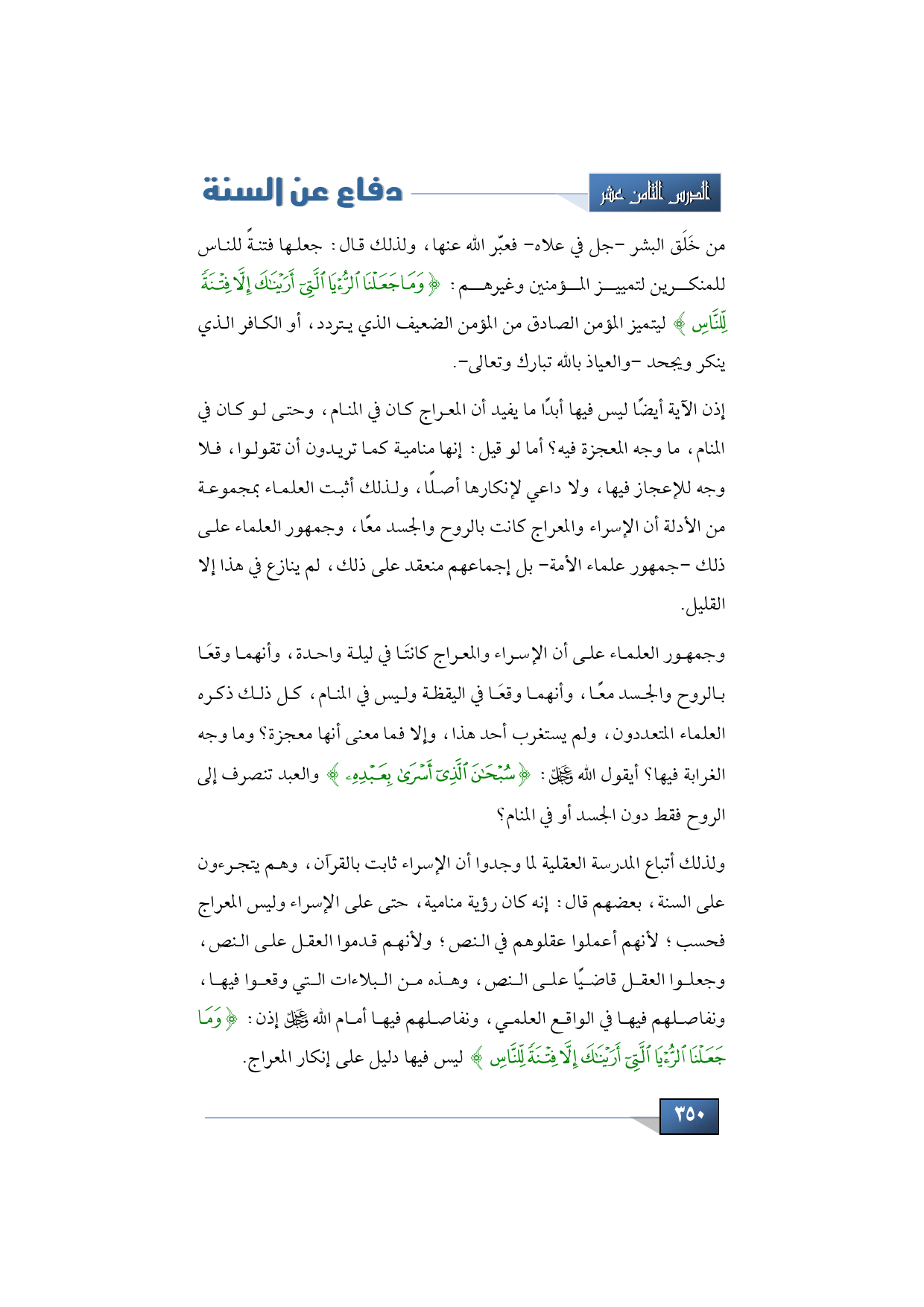 إذن الآية أيضًا ليس فيها أبدًا ما يفيد أن المعراج كان في المنام، وحتى لو كان في المنام، ما وجه المعجزة فيه؟ أما لو قيل: إنها منامية كما تريدون أن تقولوا، فلا وجه للإعجاز فيها، ولا داعي لإنكارها أصلًا، ولذلك أثبت العلماء بمجموعة من الأدلة أن الإسراء والمعراج كانت بالروح والجسد معًا، وجمهور العلماء على ذلك -جمهور علماء الأمة- بل إجماعهم منعقد على ذلك، لم ينازع في هذا إلا القليل.