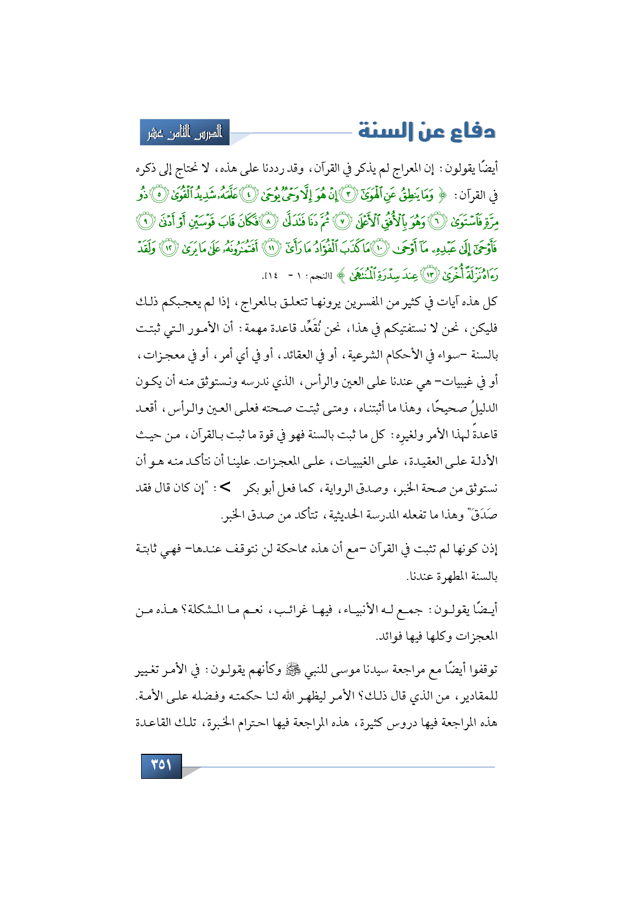 أيضًا يقولون: إن المعراج لم يذكر في القرآن، وقد رددنا على هذه، لا نحتاج إلى ذكره في القرآن: {وَالنَّجْمِ إِذَا هَوَى * مَا ضَلَّ صَاحِبُكُمْ وَمَا غَوَى * وَمَا يَنْطِقُ عَنِ الْهَوَى * إِنْ هُوَ إِلَّا وَحْيٌ يُوحَى * عَلَّمَهُ شَدِيدُ الْقُوَى * ذُو مِرَّةٍ فَاسْتَوَى * وَهُوَ بِالْأُفُقِ الْأَعْلَى * ثُمَّ دَنَا فَتَدَلَّى * فَكَانَ قَابَ قَوْسَيْنِ أَوْ أَدْنَى * فَأَوْحَى إِلَى عَبْدِهِ مَا أَوْحَى * مَا كَذَبَ الْفُؤَادُ مَا رَأَى * أَفَتُمَارُونَهُ عَلَى مَا يَرَى * وَلَقَدْ رَآهُ نَزْلَةً أُخْرَى * عِنْدَ سِدْرَةِ الْمُنْتَهَى} (النجم: 1 - 14).