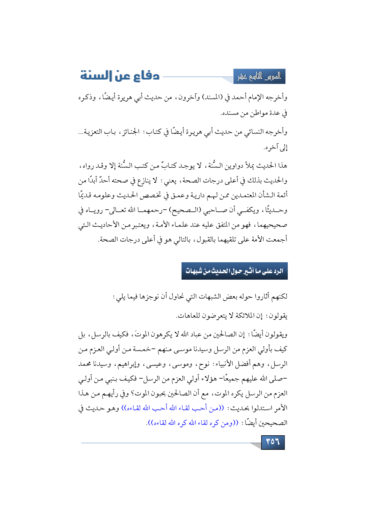 ويقولون أيضًا: إن الصالحين من عباد الله لا يكرهون الموتَ، فكيف بالرسل، بل كيف بأولي العزم من الرسل وسيدنا موسى منهم -خمسة من أولي العزم من الرسل، وهم أفضل الأنبياء: نوح، وموسى، وعيسى، وإبراهيم، وسيدنا محمد -صلى الله عليهم جميعًا- هؤلاء أولي العزم من الرسل- فكيف بنبي من أولي العزم من الرسل يكره الموت، مع أن الصالحين يحبون الموت؟ وفي رأيهم من هذا الأمر استدلوا بحديث: ((من أحب لقاء الله أحب الله لقاءه)) وهو حديث في الصحيحين أيضًا: ((ومن كره لقاء الله كره الله لقاءه)).