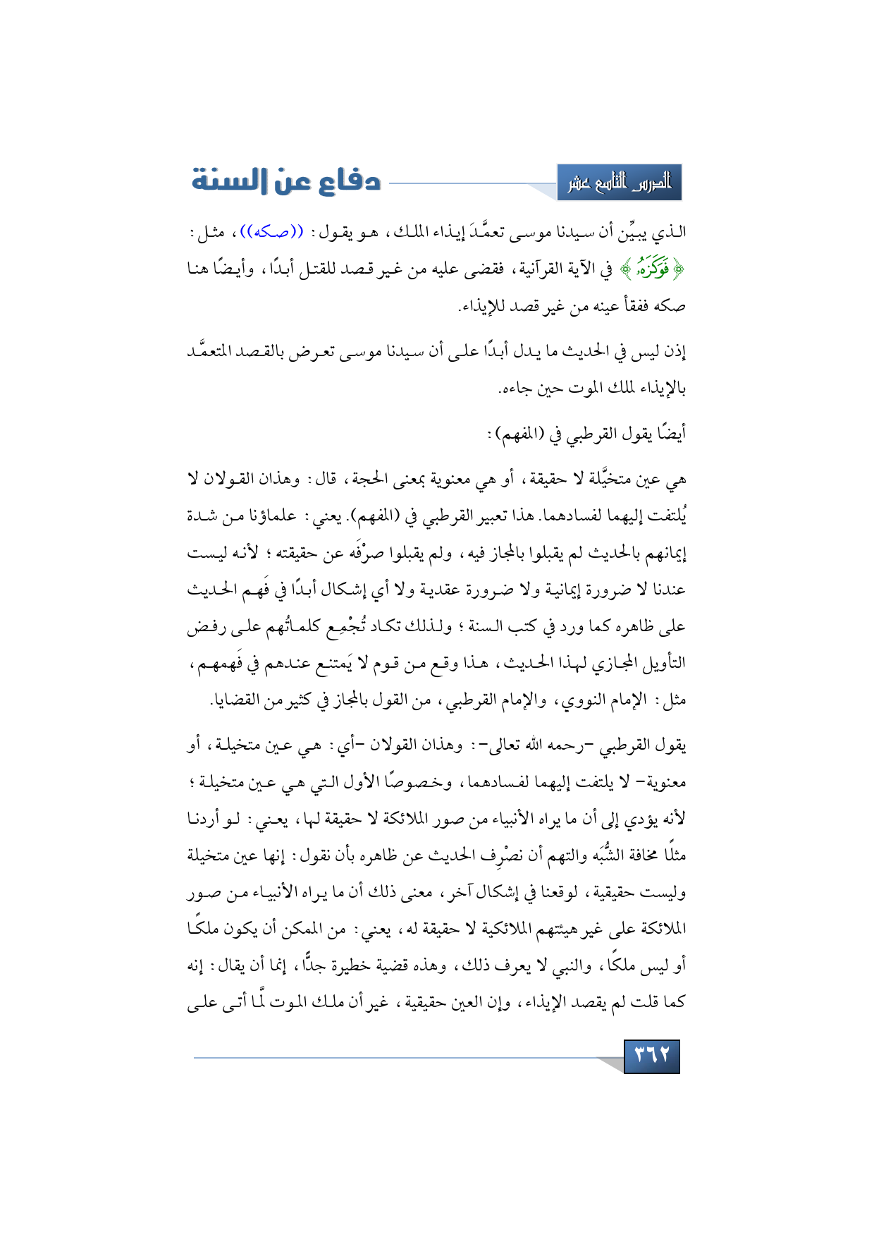 يقول القرطبي -رحمه الله تعالى-: وهذان القولان -أي: هي عين متخيلة، أو معنوية- لا يلتفت إليهما لفسادهما، وخصوصًا الأول التي هي عين متخيلة؛ لأنه يؤدي إلى أن ما يراه الأنبياء من صور الملائكة لا حقيقة لها، يعني: لو أردنا مثلًا مخافة الشُّبَه والتهم أن نصْرِف الحديث عن ظاهره بأن نقول: إنها عين متخيلة وليست حقيقية، لوقعنا في إشكال آخر، معنى ذلك أن ما يراه الأنبياء من صور الملائكة على غير هيئتهم الملائكية لا حقيقة له، يعني: من الممكن أن يكون ملكًا أو ليس ملكًا، والنبي لا يعرف ذلك، وهذه قضية خطيرة جدًّا، إنما أن يقال: إنه كما قلت لم يقصد الإيذاء، وإن العين حقيقية، غير أن ملك الموت لمَّا أتى على
