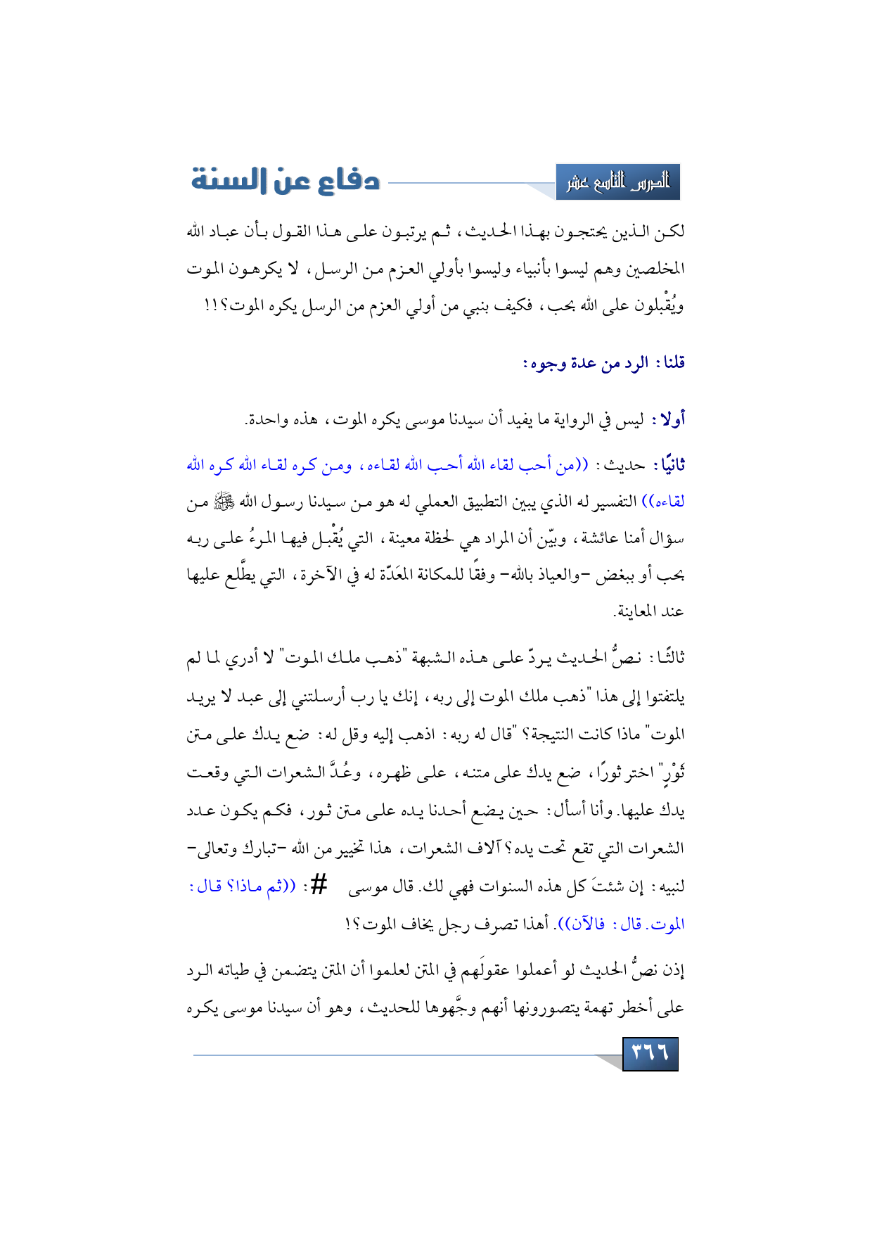 ثالثًا: نصُّ الحديث يردّ على هذه الشبهة "ذهب ملك الموت" لا أدري لما لم يلتفتوا إلى هذا "ذهب ملك الموت إلى ربه، إنك يا رب أرسلتني إلى عبد لا يريد الموت" ماذا كانت النتيجة؟ "قال له ربه: اذهب إليه وقل له: ضع يدك على متن ثَوْرٍ" اختر ثورًا، ضع يدك على متنه، على ظهره، وعُدَّ الشعرات التي وقعت يدك عليها. وأنا أسأل: حين يضع أحدنا يده على متن ثور، فكم يكون عدد الشعرات التي تقع تحت يده؟ آلاف الشعرات، هذا تخيير من الله -تبارك وتعالى- لنبيه: إن شئتَ كل هذه السنوات فهي لك. قال موسى -عليه السلام-: ((ثم ماذا؟ قال: الموت. قال: فالآن)). أهذا تصرف رجل يخاف الموت؟!