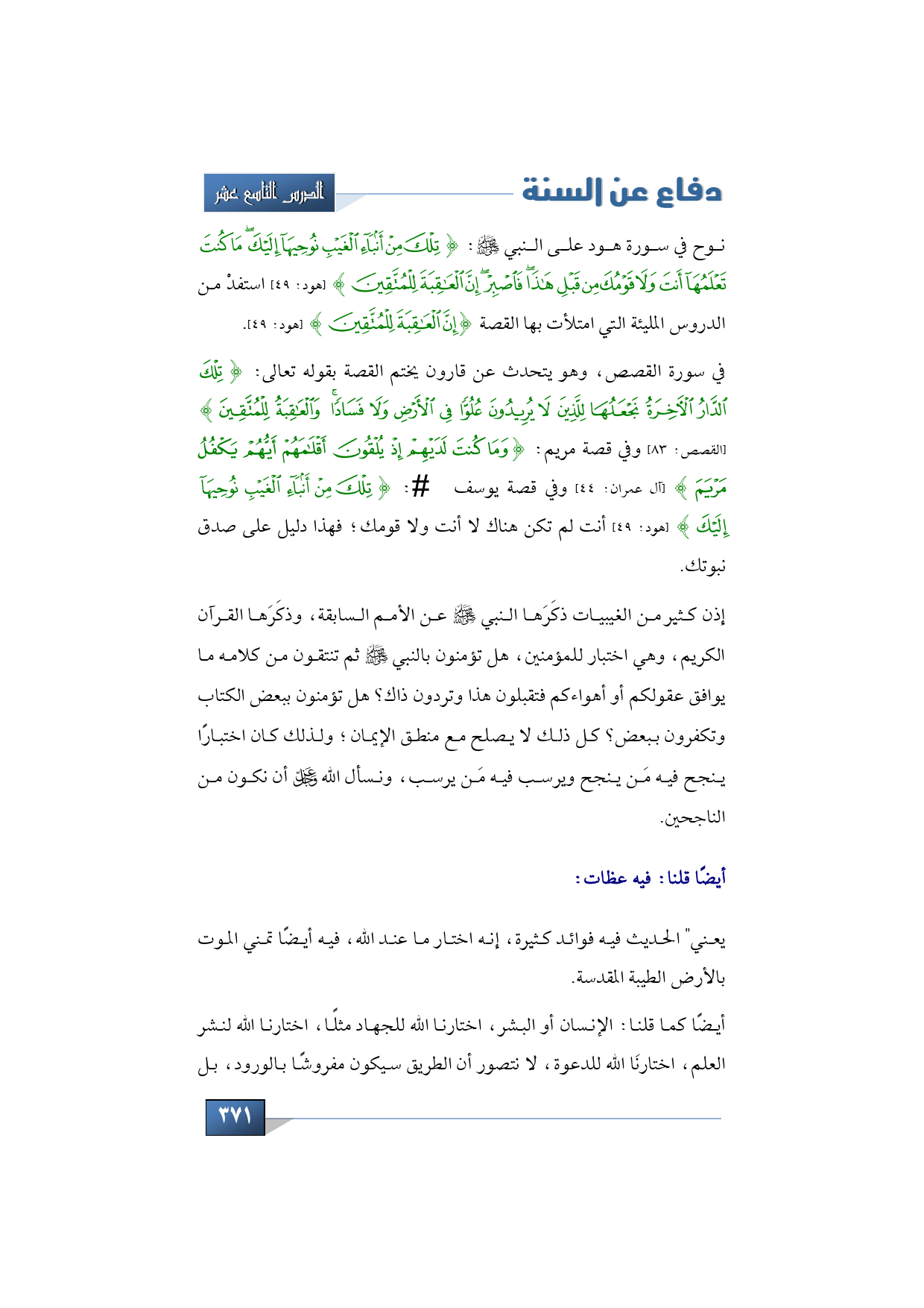 في سورة القصص، وهو يتحدث عن قارون يختم القصة بقوله تعالى: {تِلْكَ الدَّارُ الْآخِرَةُ نَجْعَلُهَا لِلَّذِينَ لَا يُرِيدُونَ عُلُوًّا فِي الْأَرْضِ وَلَا فَسَادًا وَالْعَاقِبَةُ لِلْمُتَّقِينَ} (القصص: 83) وفي قصة مريم: {وَمَا كُنْتَ لَدَيْهِمْ إِذْ يُلْقُونَ أَقْلَامَهُمْ أَيُّهُمْ يَكْفُلُ مَرْيَمَ} (آل عمران: 44) وفي قصة يوسف -عليه السلام-: {تِلْكَ مِنْ أَنْبَاءِ الْغَيْبِ نُوحِيهَا إِلَيْكَ} (هود: 49) أنت لم تكن هناك لا أنت ولا قومك؛ فهذا دليل على صدق نبوتك.