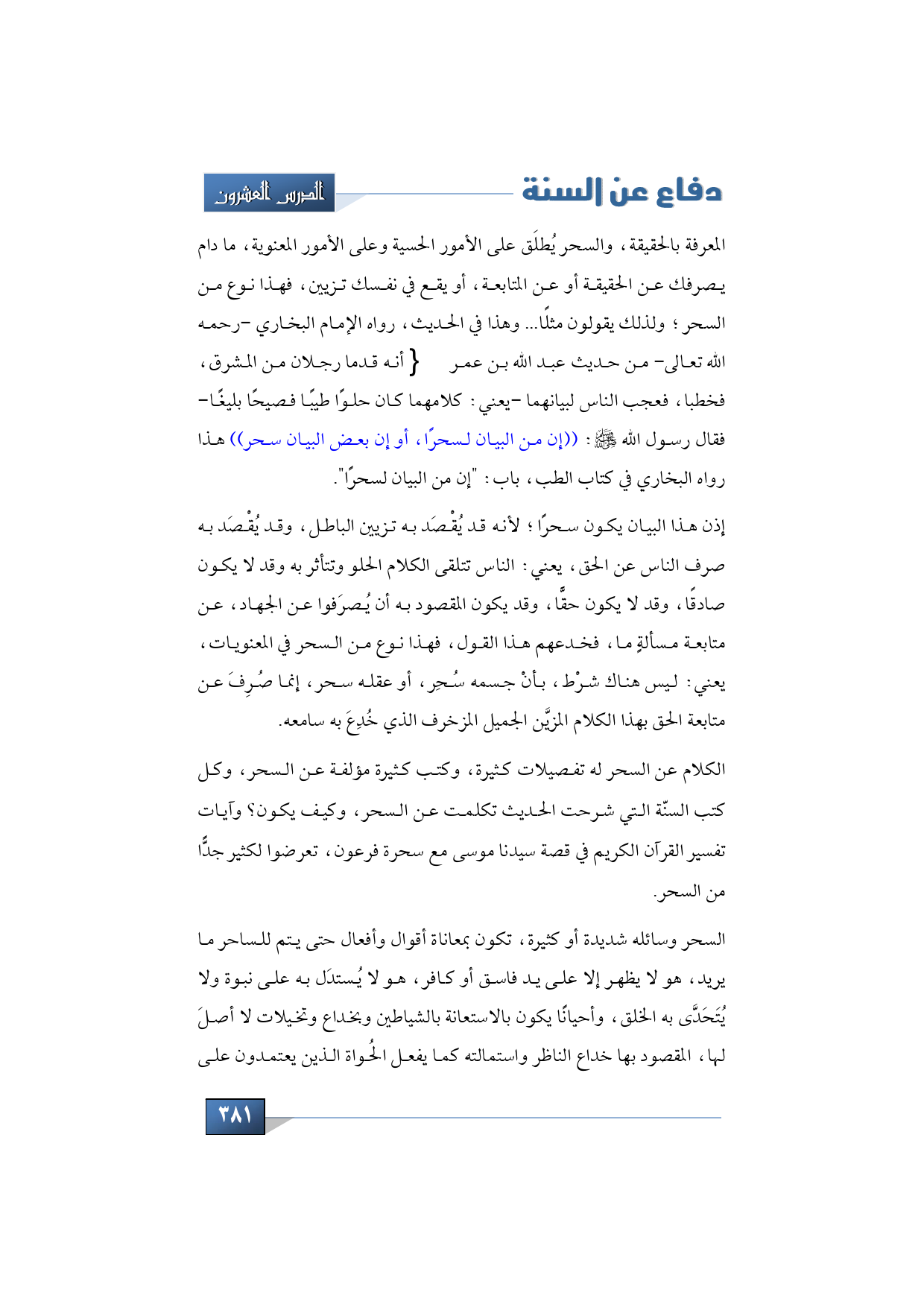 المعرفة بالحقيقة، والسحر يُطلَق على الأمور الحسية وعلى الأمور المعنوية، ما دام يصرفك عن الحقيقة أو عن المتابعة، أو يقع في نفسك تزيين، فهذا نوع من السحر؛ ولذلك يقولون مثلًا ... وهذا في الحديث، رواه الإمام البخاري -رحمه الله تعالى- من حديث عبد الله بن عمر -رضي الله تعالى عنهما- أنه قدما رجلان من المشرق، فخطبا، فعجب الناس لبيانهما -يعني: كلامهما كان حلوًا طيبًا فصيحًا بليغًا- فقال رسول الله -صلى الله عليه وسلم-: ((إن من البيان لسحرًا، أو إن بعض البيان سحر)) هذا رواه البخاري في كتاب الطب، باب: "إن من البيان لسحرًا".