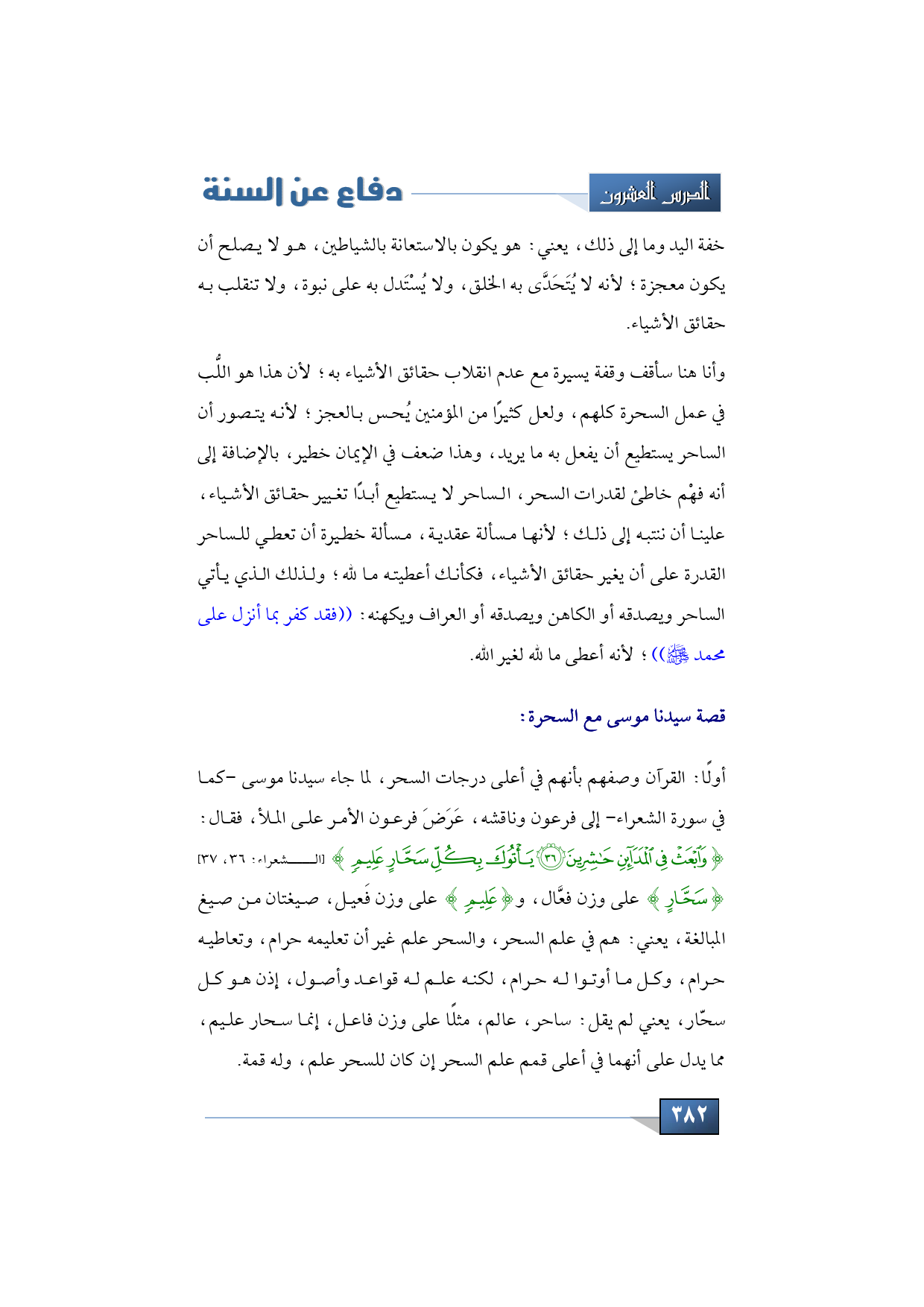 وأنا هنا سأقف وقفة يسيرة مع عدم انقلاب حقائق الأشياء به؛ لأن هذا هو اللُّب في عمل السحرة كلهم، ولعل كثيرًا من المؤمنين يُحس بالعجز؛ لأنه يتصور أن الساحر يستطيع أن يفعل به ما يريد، وهذا ضعف في الإيمان خطير، بالإضافة إلى أنه فهْم خاطئ لقدرات السحر، الساحر لا يستطيع أبدًا تغيير حقائق الأشياء، علينا أن ننتبه إلى ذلك؛ لأنها مسألة عقدية، مسألة خطيرة أن تعطي للساحر القدرة على أن يغير حقائق الأشياء، فكأنك أعطيته ما لله؛ ولذلك الذي يأتي الساحر ويصدقه أو الكاهن ويصدقه أو العراف ويكهنه: ((فقد كفر بما أنزل على محمد -صلى الله عليه وسلم-))؛ لأنه أعطى ما لله لغير الله.