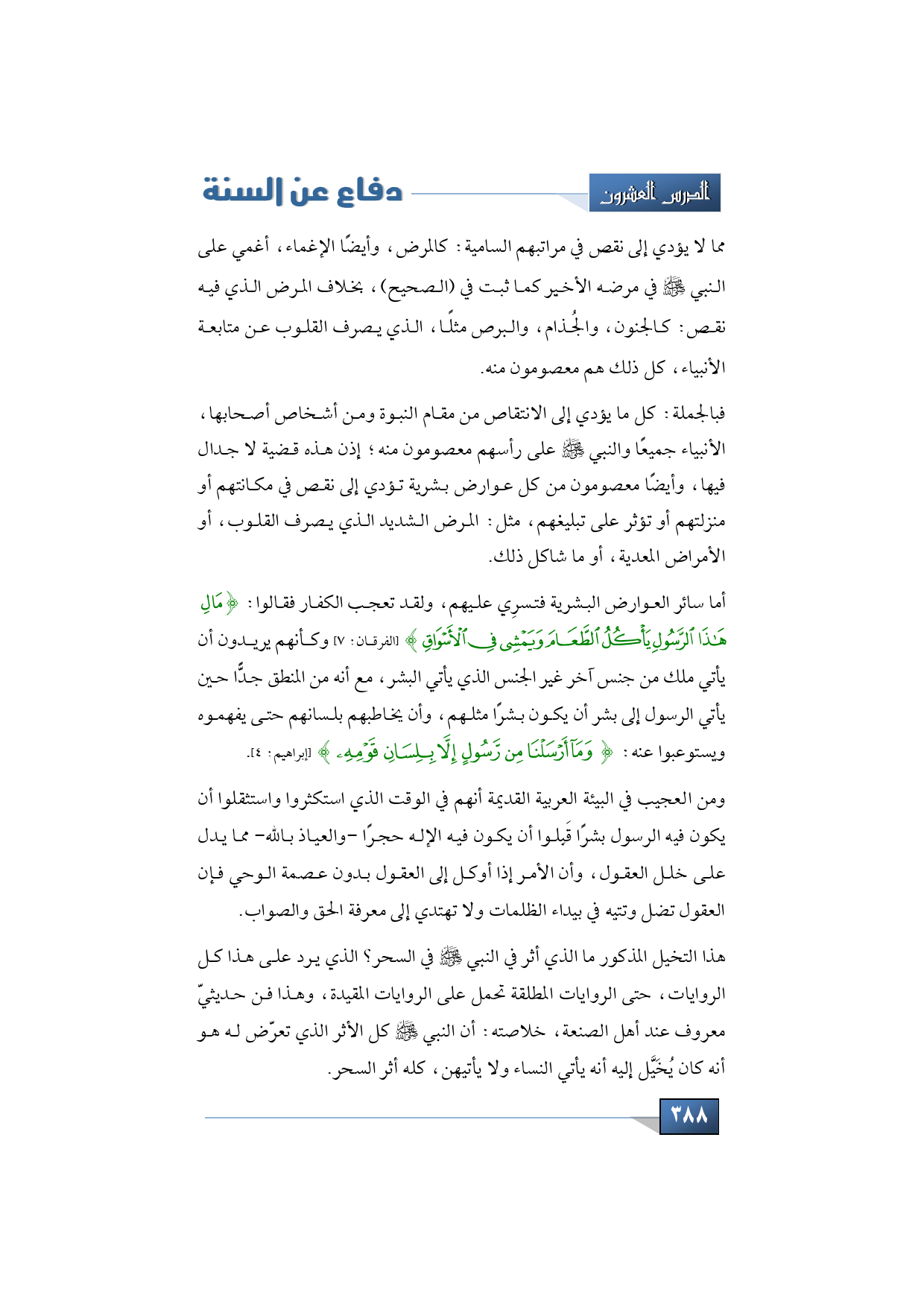 أما سائر العوارض البشرية فتسرِي عليهم، ولقد تعجب الكفار فقالوا: {مَالِ هَذَا الرَّسُولِ يَأْكُلُ الطَّعَامَ وَيَمْشِي فِي الْأَسْوَاقِ} (الفرقان: 7) وكأنهم يريدون أن يأتي ملك من جنس آخر غير الجنس الذي يأتي البشر، مع أنه من المنطق جدًّا حين يأتي الرسول إلى بشر أن يكون بشرًا مثلهم، وأن يخاطبهم بلسانهم حتى يفهموه ويستوعبوا عنه: {وَمَا أَرْسَلْنَا مِنْ رَسُولٍ إِلَّا بِلِسَانِ قَوْمِهِ} (إبراهيم: 4).