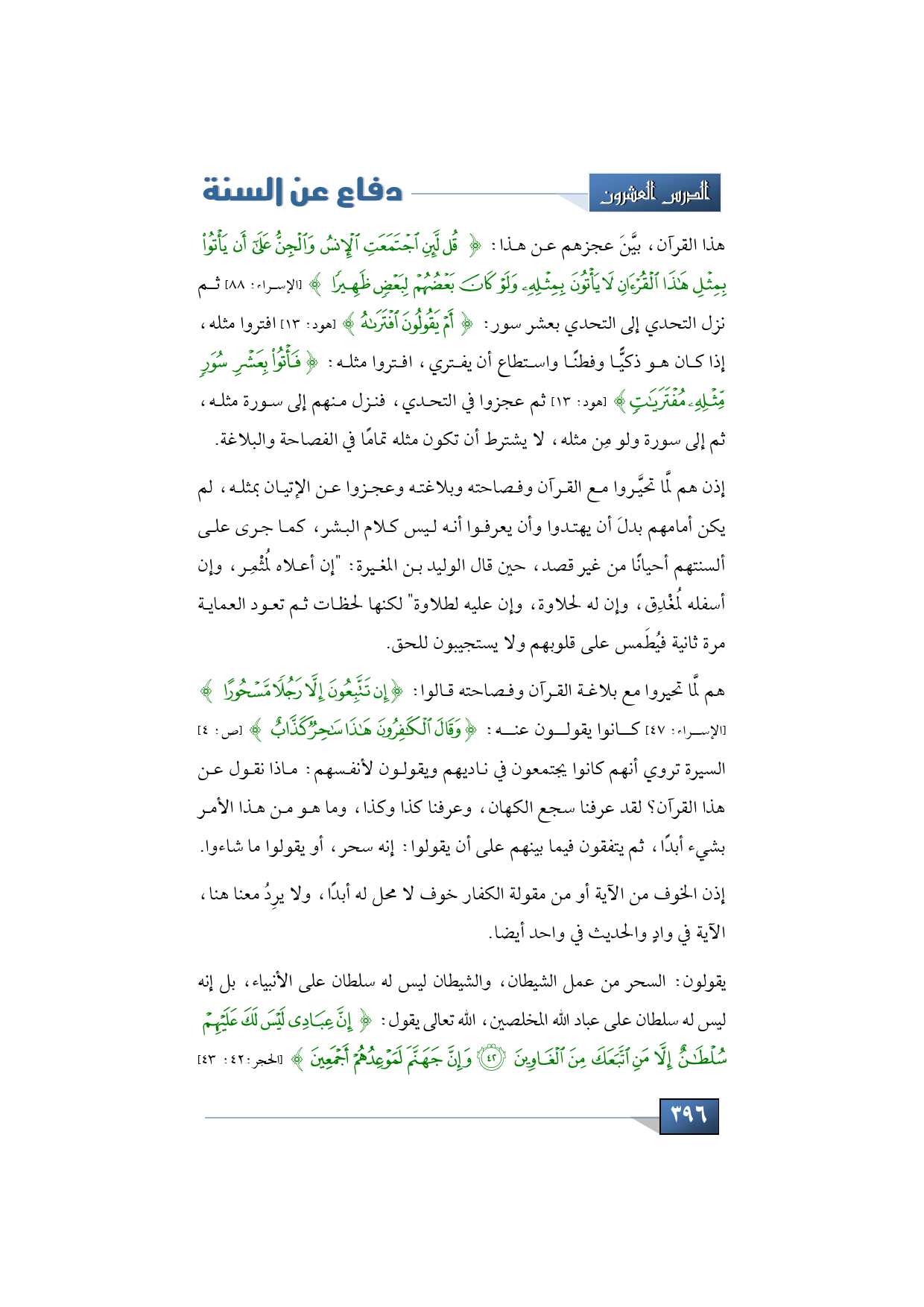 هذا القرآن، بيَّنَ عجزهم عن هذا: {قُلْ لَئِنِ اجْتَمَعَتِ الْإِنْسُ وَالْجِنُّ عَلَى أَنْ يَأْتُوا بِمِثْلِ هَذَا الْقُرْآنِ لَا يَأْتُونَ بِمِثْلِهِ وَلَوْ كَانَ بَعْضُهُمْ لِبَعْضٍ ظَهِيرًا} (الإسراء: 88) ثم نزل التحدي إلى التحدي بعشر سور: {أَمْ يَقُولُونَ افْتَرَاهُ} (هود: 13) افتروا مثله، إذا كان هو ذكيًّا وفطنًا واستطاع أن يفتري، افتروا مثله: {فَأْتُوا بِعَشْرِ سُوَرٍ مِثْلِهِ مُفْتَرَيَاتٍ} (هود: 13) ثم عجزوا في التحدي، فنزل منهم إلى سورة مثله، ثم إلى سورة ولو مِن مثله، لا يشترط أن تكون مثله تمامًا في الفصاحة والبلاغة.