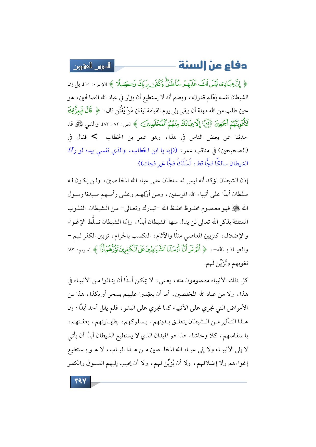 {إِنَّ عِبَادِي لَيْسَ لَكَ عَلَيْهِمْ سُلْطَانٌ وَكَفَى بِرَبِّكَ وَكِيلًا} (الإسراء: 65). بل إن الشيطان نفسه يَعْلم قدراتِه، ويعلم أنه لا يستطيع أن يؤثر في عباد الله الصالحين، هو حين طلب من الله مهلة أن يبقى إلى يوم القيامة ليفتن مَنْ يُفْتَن قال: {قَالَ فَبِعِزَّتِكَ لَأُغْوِيَنَّهُمْ أَجْمَعِينَ * إِلَّا عِبَادَكَ مِنْهُمُ الْمُخْلَصِينَ} (ص: 82، 83). والنبي -صلى الله عليه وسلم- قد حدثنا عن بعض الناس في هذا، وهو عمر بن الخطاب -رضي الله تعالى عنه- فقال في (الصحيحين) في مناقب عمر: ((إيه يا ابن الخطاب، والذي نفسي بيده لو رآك الشيطان سالكًا فجًّا قط، لَسَلَكَ فجًّا غير فجك)).