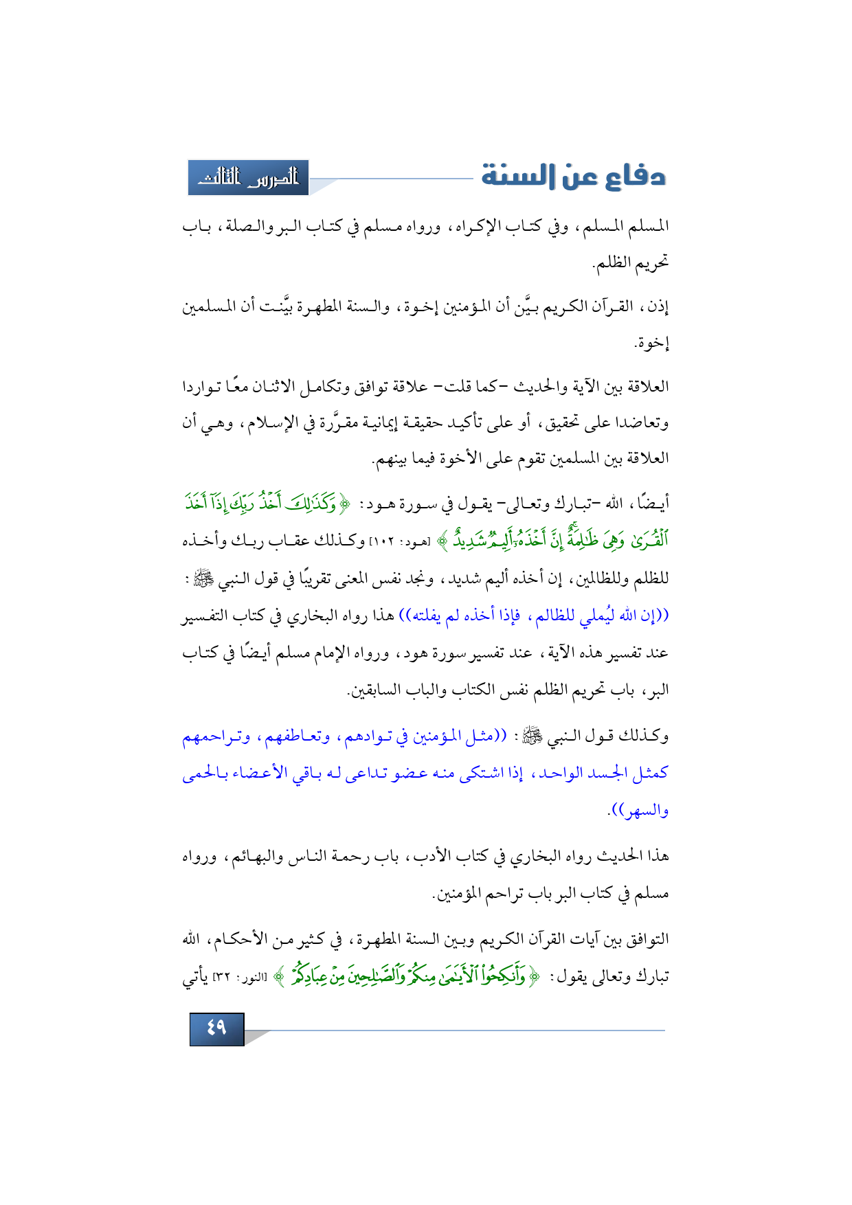 أيضًا، الله -تبارك وتعالى- يقول في سورة هود: {وَكَذَلِكَ أَخْذُ رَبِّكَ إِذَا أَخَذَ الْقُرَى وَهِيَ ظَالِمَةٌ إِنَّ أَخْذَهُ أَلِيمٌ شَدِيدٌ} (هود: 102) وكذلك عقاب ربك وأخذه للظلم وللظالمين، إن أخذه أليم شديد، ونجد نفس المعنى تقريبًا في قول النبي -صلى الله عليه وسلم-: ((إن الله ليُملي للظالم، فإذا أخذه لم يفلته)) هذا رواه البخاري في كتاب التفسير عند تفسير هذه الآية، عند تفسير سورة هود، ورواه الإمام مسلم أيضًا في كتاب البر، باب تحريم الظلم نفس الكتاب والباب السابقين.