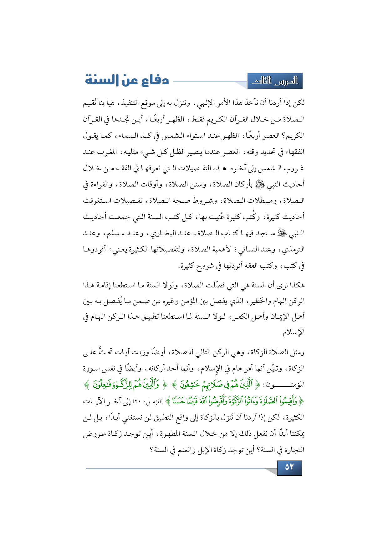 هكذا نرى أن السنة هي التي فصّلت الصلاة، ولولا السنة ما استطعنا إقامة هذا الركن الهام والخطير، الذي يفصل بين المؤمن وغيره من ضمن ما يُفصل به بين أهل الإيمان وأهل الكفر، لولا السنة لما استطعنا تطبيق هذا الركن الهام في الإسلام.