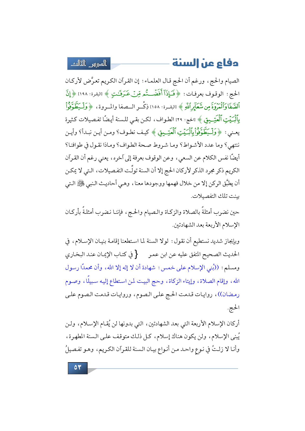 وبإيجاز شديد نستطيع أن نقول: لولا السنة لما استطعنا إقامة بنيان الإسلام، في الحديث الصحيح المتفق عليه عن ابن عمر -رضي الله تعالى عنهما- في كتاب الإيمان عند البخاري ومسلم: ((بُني الإسلام على خمس: شهادة أن لا إله إلا الله، وأن محمدًا رسول الله، وإقام الصلاة، وإيتاء الزكاة، وحج البيت لمن استطاع إليه سبيلًا، وصوم رمضان))، روايات قدمت الحج على الصوم، وروايات قدمت الصوم على الحج.
