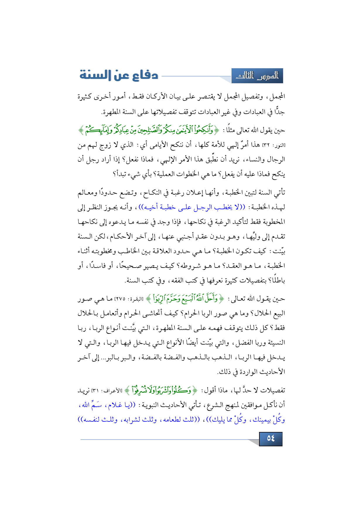 تأتي السنة لتبين الخطبة، وأنها إعلان رغبة في النكاح، وتضع حدودًا ومعالم لهذه الخطبة: ((لا يخطب الرجل على خطبة أخيه))، وأنه يجوز النظر إلى المخطوبة فقط لتأكيد الرغبة في نكاحها، فإذا وجد في نفسه ما يدعوه إلى نكاحها تقدم إلى وليِّها، وهو بدون عقدٍ أجنبي عنها، إلى آخر الأحكام، لكن السنة بيّنت: كيف تكون الخطبة؟ ما هي حدود العلاقة بين الخاطب ومخطوبته أثناء الخطبة، ما هو العقد؟ ما هو شروطه؟ كيف يصير صحيحًا، أو فاسدًا، أو باطلًا؟ بتفصيلات كثيرة نعرفها في كتب الفقه، وفي كتب السنة.