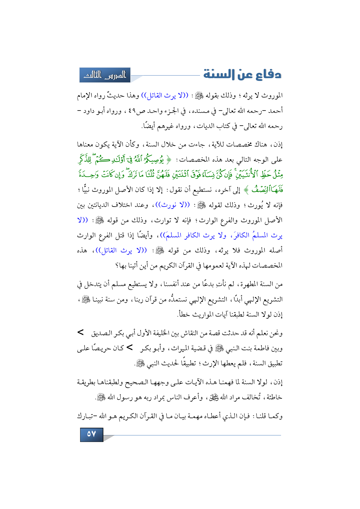 من السنة المطهرة، لم نأتِ بدعًا من عند أنفسنا، ولا يستطيع مسلم أن يتدخل في التشريع الإلهي أبدًا، التشريع الإلهي نستمدُّه من قرآن ربنا، ومن سنة نبينا -صلى الله عليه وسلم-، إذن لولا السنة لطبقنا آيات المواريث خطأ.