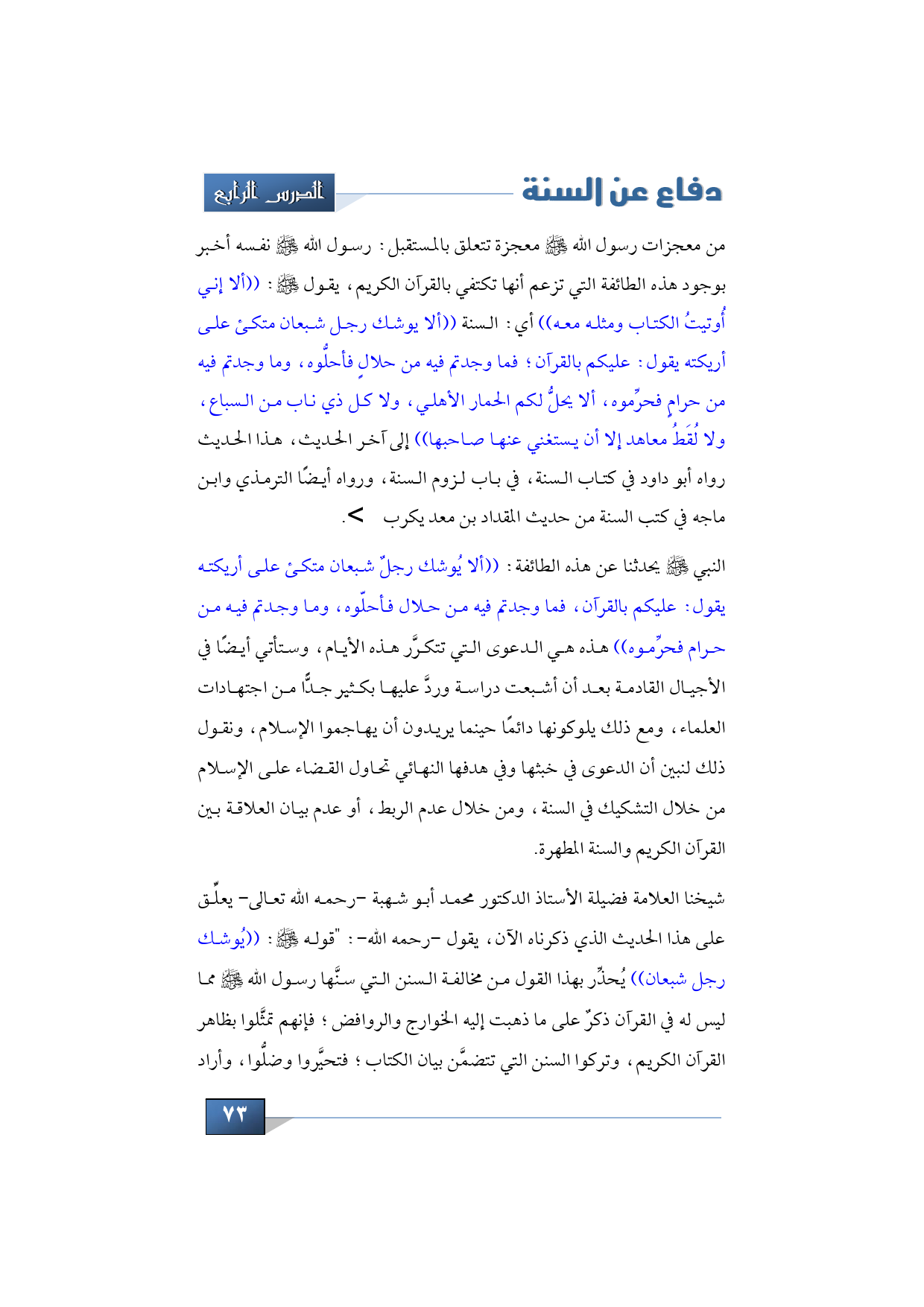 شيخنا العلامة فضيلة الأستاذ الدكتور محمد أبو شهبة -رحمه الله تعالى- يعلِّق على هذا الحديث الذي ذكرناه الآن، يقول -رحمه الله-: "قوله -عليه الصلاة والسلام-: ((يُوشك رجل شبعان)) يُحذِّر بهذا القول من مخالفة السنن التي سنَّها رسول الله -صلى الله عليه وسلم- مما ليس له في القرآن ذكرٌ على ما ذهبت إليه الخوارج والروافض؛ فإنهم تمثَّلوا بظاهر القرآن الكريم، وتركوا السنن التي تتضمَّن بيان الكتاب؛ فتحيَّروا وضلُّوا، وأراد
