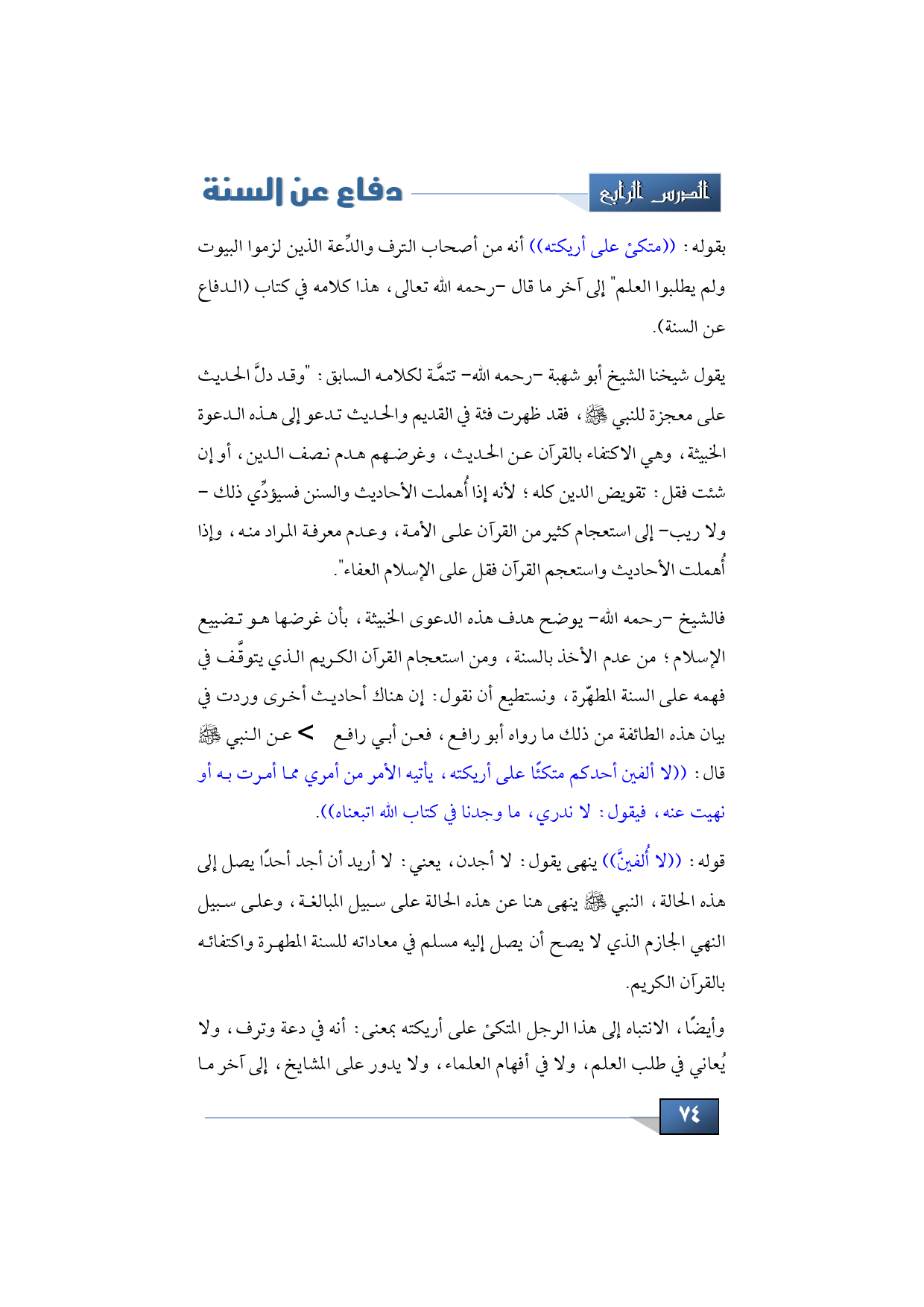 فالشيخ -رحمه الله- يوضح هدف هذه الدعوى الخبيثة، بأن غرضها هو تضييع الإسلام؛ من عدم الأخذ بالسنة، ومن استعجام القرآن الكريم الذي يتوقَّف في فهمه على السنة المطهّرة، ونستطيع أن نقول: إن هناك أحاديث أخرى وردت في بيان هذه الطائفة من ذلك ما رواه أبو رافع، فعن أبي رافع -رضي الله تعالى عنه- عن النبي -صلى الله عليه وسلم- قال: ((لا ألفين أحدكم متكئًا على أريكته، يأتيه الأمر من أمري مما أمرت به أو نهيت عنه، فيقول: لا ندري، ما وجدنا في كتاب الله اتبعناه)).