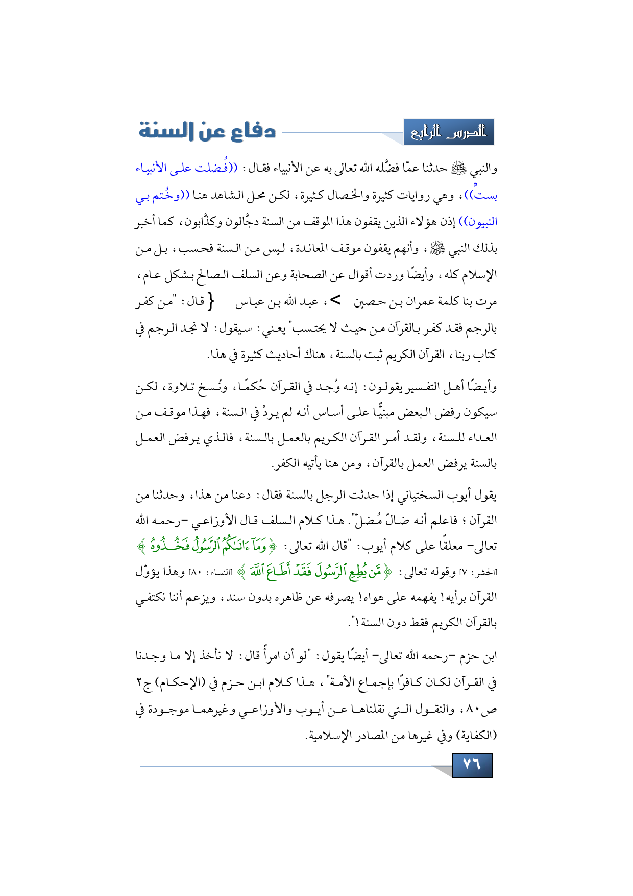 والنبي -صلى الله عليه وسلم- حدثنا عمّا فضَّله الله تعالى به عن الأنبياء فقال: ((فُضلت على الأنبياء بستٍّ))، وهي روايات كثيرة والخصال كثيرة، لكن محل الشاهد هنا ((وخُتم بي النبيون)) إذن هؤلاء الذين يقفون هذا الموقف من السنة دجَّالون وكذَّابون، كما أخبر بذلك النبي -صلى الله عليه وسلم-، وأنهم يقفون موقف المعاندة، ليس من السنة فحسب، بل من الإسلام كله، وأيضًا وردت أقوال عن الصحابة وعن السلف الصالح بشكل عام، مرت بنا كلمة عمران بن حصين -رضي الله تعالى عنه-، عبد الله بن عباس -رضي الله تعالى عنهما- قال: "من كفر بالرجم فقد كفر بالقرآن من حيث لا يحتسب" يعني: سيقول: لا نجد الرجم في كتاب ربنا، القرآن الكريم ثبت بالسنة، هناك أحاديث كثيرة في هذا.