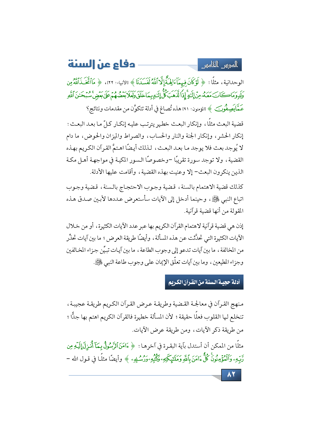 كذلك قضية الاهتمام بالسنة، قضية وجوب الاحتجاج بالسنة، قضية وجوب اتباع النبي -صلى الله عليه وسلم-، وحينما أدخل إلى الآيات سأستعرض عددها لأبين صدق هذه المقولة من أنها قضية قرآنية.