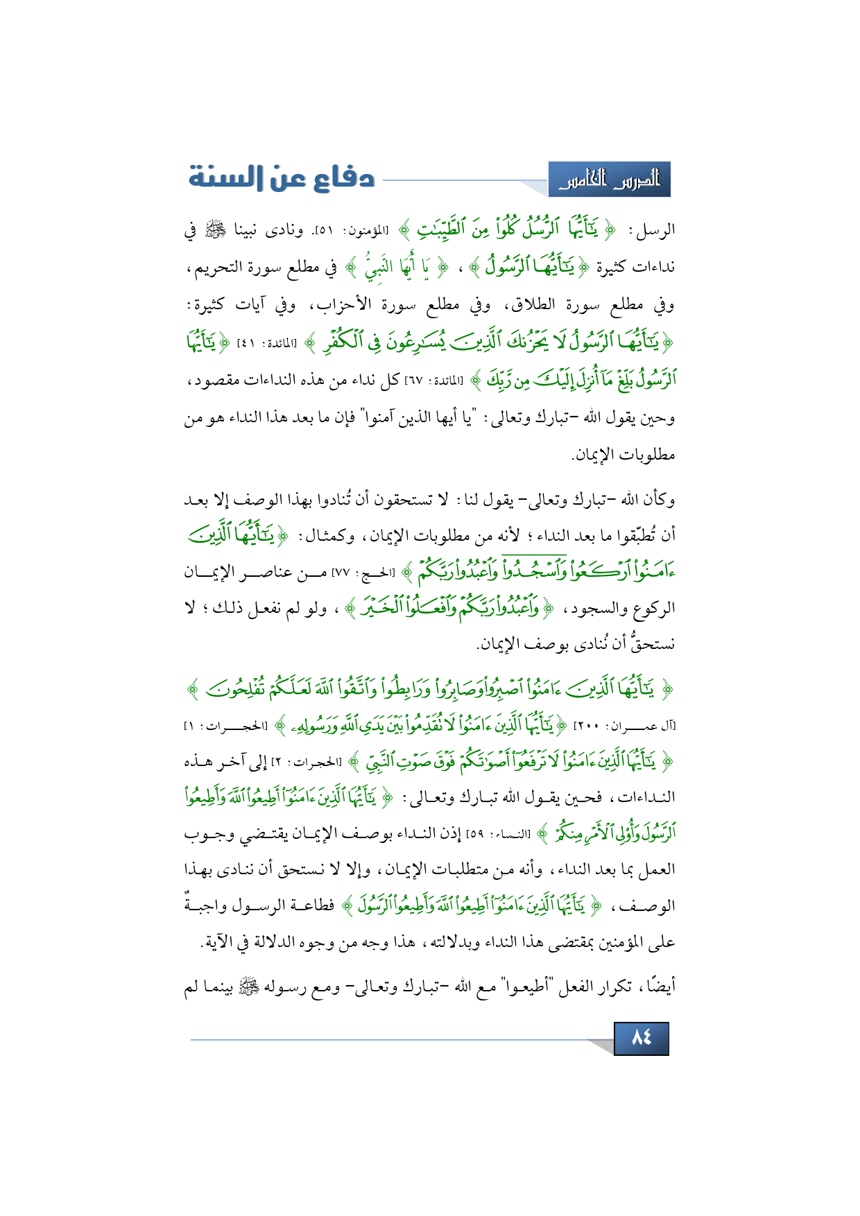 الرسل: {يَا أَيُّهَا الرُّسُلُ كُلُوا مِنَ الطَّيِّبَاتِ} (المؤمنون: 51). ونادى نبينا -صلى الله عليه وسلم- في نداءات كثيرة {يَا أَيُّهَا الرَّسُولُ}، {يَا أَيُّهَا النَّبِيُّ} في مطلع سورة التحريم، وفي مطلع سورة الطلاق، وفي مطلع سورة الأحزاب، وفي آيات كثيرة: {يَا أَيُّهَا الرَّسُولُ لَا يَحْزُنْكَ الَّذِينَ يُسَارِعُونَ فِي الْكُفْرِ} (المائدة: 41) {يَا أَيُّهَا الرَّسُولُ بَلِّغْ مَا أُنْزِلَ إِلَيْكَ مِنْ رَبِّكَ} (المائدة: 67) كل نداء من هذه النداءات مقصود، وحين يقول الله -تبارك وتعالى: "يا أيها الذين آمنوا" فإن ما بعد هذا النداء هو من مطلوبات الإيمان.