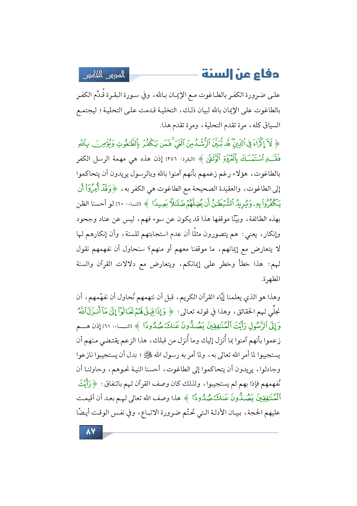 {لَا إِكْرَاهَ فِي الدِّينِ قَدْ تَبَيَّنَ الرُّشْدُ مِنَ الْغَيِّ فَمَنْ يَكْفُرْ بِالطَّاغُوتِ وَيُؤْمِنْ بِاللَّهِ فَقَدِ اسْتَمْسَكَ بِالْعُرْوَةِ الْوُثْقَى} (البقرة: 256) إذن هذه هي مهمة الرسل الكفر بالطاغوت، هؤلاء رغم زعمهم بأنهم آمنوا بالله وبالرسول يريدون أن يتحاكموا إلى الطاغوت، والعقيدة الصحيحة مع الطاغوت هي الكفر به، {وَقَدْ أُمِرُوا أَنْ يَكْفُرُوا بِهِ وَيُرِيدُ الشَّيْطَانُ أَنْ يُضِلَّهُمْ ضَلَالًا بَعِيدًا} (النساء: 60) لو أحسنا الظن بهذه الطائفة، وبيّنّا موقفها هذا قد يكون عن سوء فهم، ليس عن عناد وجحود وإنكار، يعني: هم يتصورون مثلًا أن عدم استجابتهم للسنة، وأن إنكارهم لها لا يتعارض مع إيمانهم، ما موقفنا معهم أو منهم؟ سنحاول أن نفهمهم نقول لهم: هذا خطأ وخطر على إيمانكم، ويتعارض مع دلالات القرآن والسنة المطهرة.