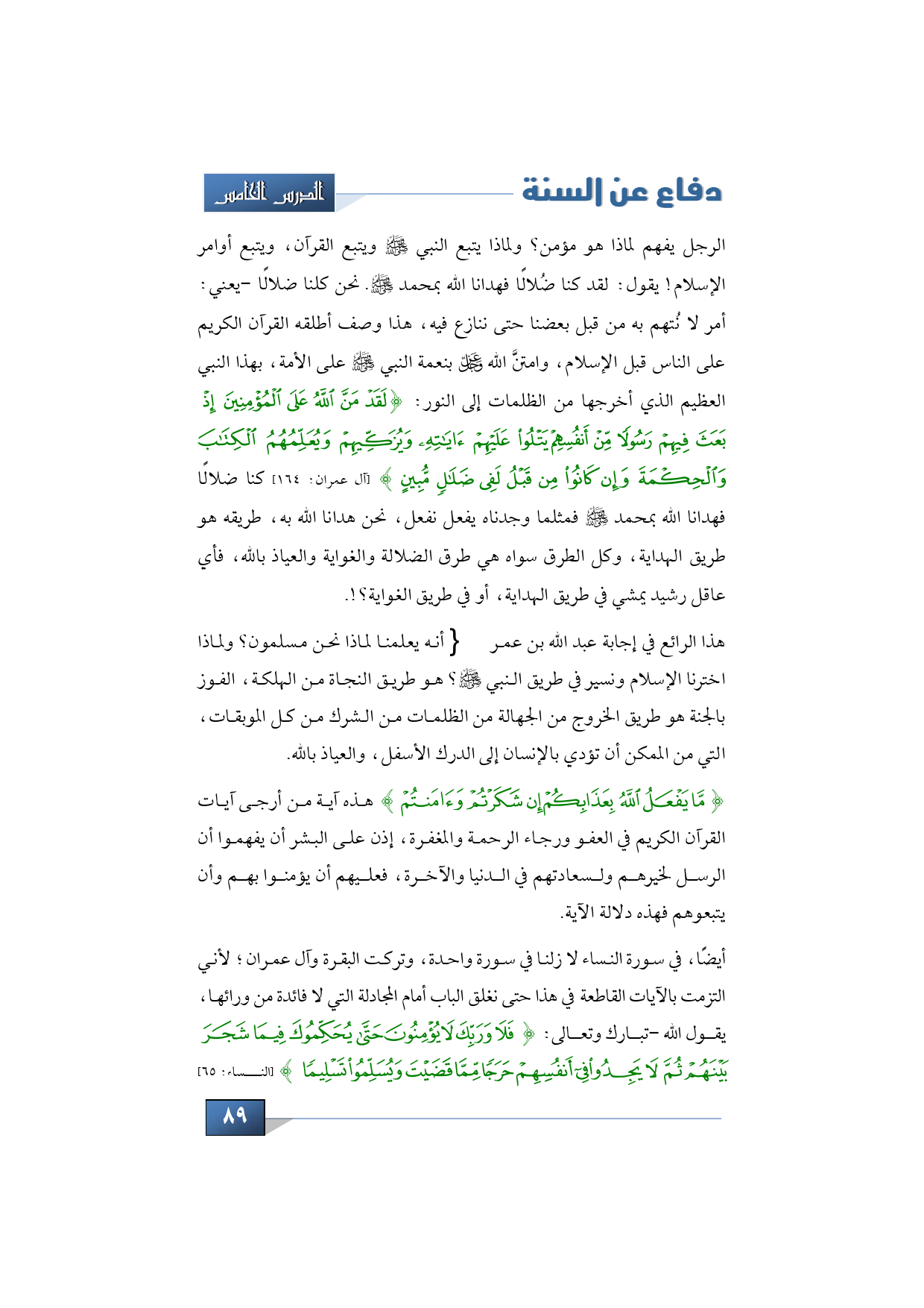 هذا الرائع في إجابة عبد الله بن عمر -رضي الله تعالى عنهما- أنه يعلمنا لماذا نحن مسلمون؟ ولماذا اخترنا الإسلام ونسير في طريق النبي -صلى الله عليه وسلم؟ هو طريق النجاة من الهلكة، الفوز بالجنة هو طريق الخروج من الجهالة من الظلمات من الشرك من كل الموبقات، التي من الممكن أن تؤدي بالإنسان إلى الدرك الأسفل، والعياذ بالله.