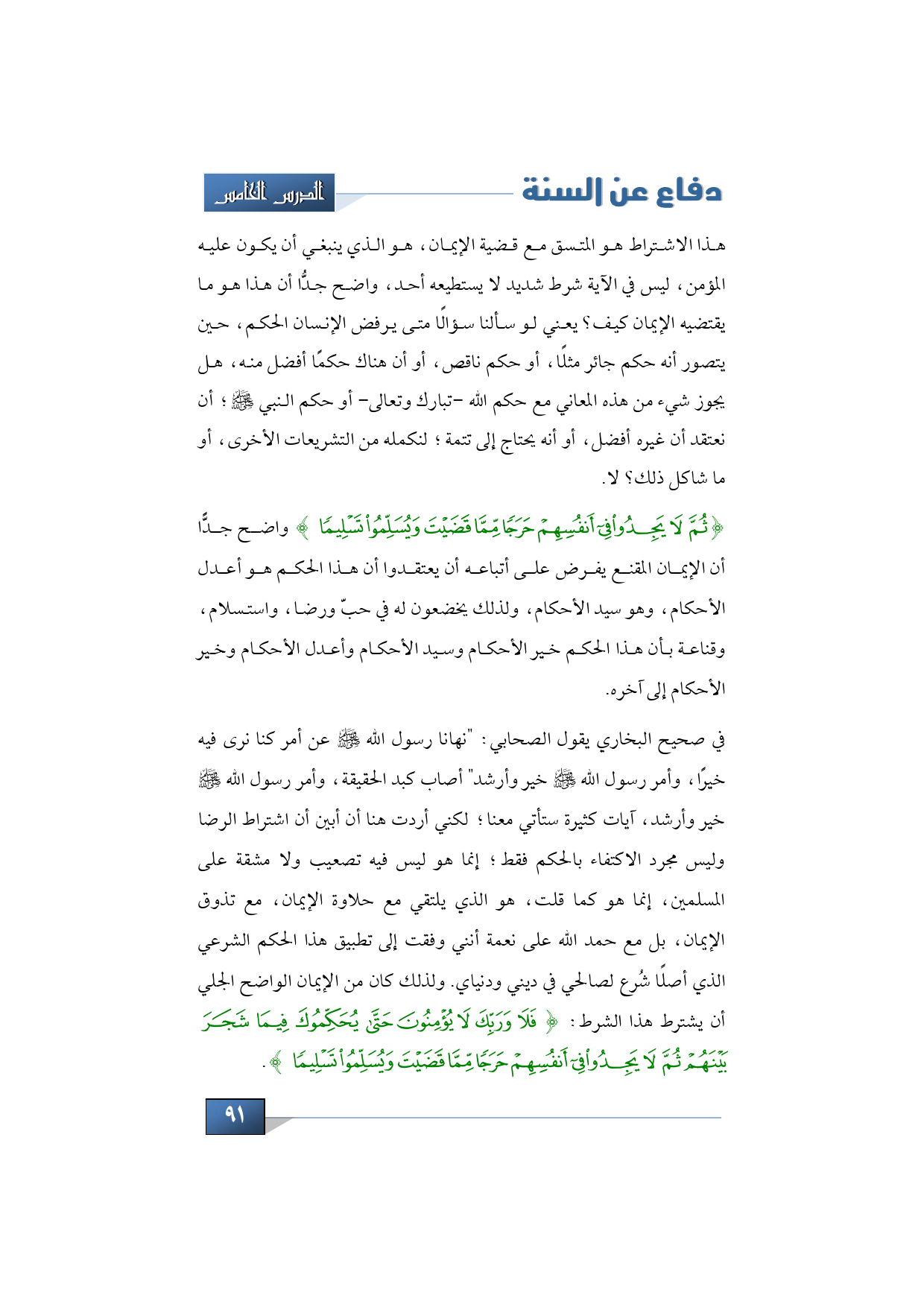 في صحيح البخاري يقول الصحابي: "نهانا رسول الله -صلى الله عليه وسلم- عن أمر كنا نرى فيه خيرًا، وأمر رسول الله -صلى الله عليه وسلم- خير وأرشد" أصاب كبد الحقيقة، وأمر رسول الله -صلى الله عليه وسلم- خير وأرشد، آيات كثيرة ستأتي معنا؛ لكني أردت هنا أن أبين أن اشتراط الرضا وليس مجرد الاكتفاء بالحكم فقط؛ إنما هو ليس فيه تصعيب ولا مشقة على المسلمين، إنما هو كما قلت، هو الذي يلتقي مع حلاوة الإيمان، مع تذوق الإيمان، بل مع حمد الله على نعمة أنني وفقت إلى تطبيق هذا الحكم الشرعي الذي أصلًا شُرع لصالحي في ديني ودنياي. ولذلك كان من الإيمان الواضح الجلي أن يشترط هذا الشرط: {فَلَا وَرَبِّكَ لَا يُؤْمِنُونَ حَتَّى يُحَكِّمُوكَ فِيمَا شَجَرَ بَيْنَهُمْ ثُمَّ لَا يَجِدُوا فِي أَنْفُسِهِمْ حَرَجًا مِمَّا قَضَيْتَ وَيُسَلِّمُوا تَسْلِيمًا}.