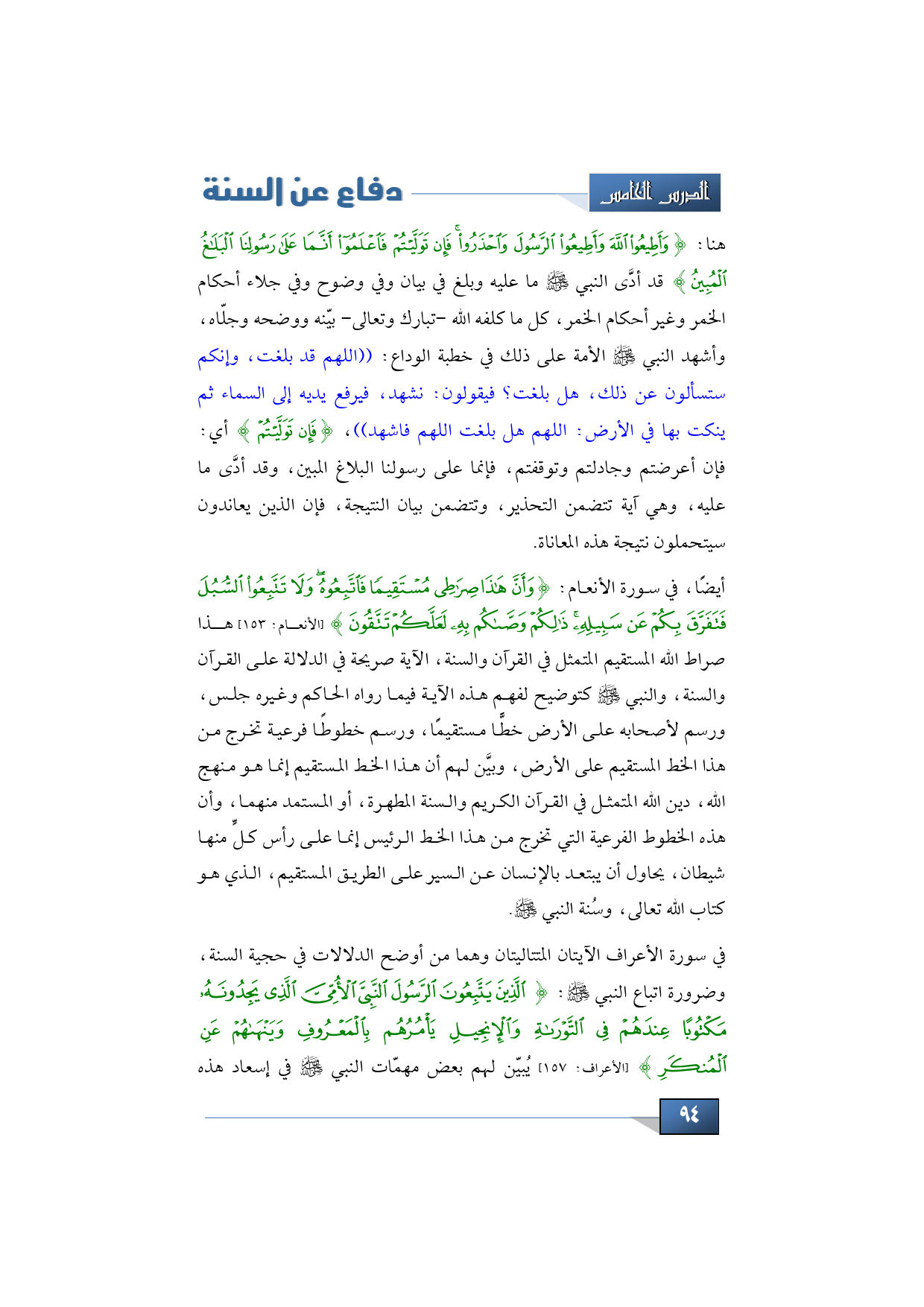 أيضًا، في سورة الأنعام: {وَأَنَّ هَذَا صِرَاطِي مُسْتَقِيمًا فَاتَّبِعُوهُ وَلَا تَتَّبِعُوا السُّبُلَ فَتَفَرَّقَ بِكُمْ عَنْ سَبِيلِهِ ذَلِكُمْ وَصَّاكُمْ بِهِ لَعَلَّكُمْ تَتَّقُون} (الأنعام: 153) هذا صراط الله المستقيم المتمثل في القرآن والسنة، الآية صريحة في الدلالة على القرآن والسنة، والنبي -صلى الله عليه وسلم- كتوضيح لفهم هذه الآية فيما رواه الحاكم وغيره جلس، ورسم لأصحابه على الأرض خطًّا مستقيمًا، ورسم خطوطًا فرعية تخرج من هذا الخط المستقيم على الأرض، وبيَّن لهم أن هذا الخط المستقيم إنما هو منهج الله، دين الله المتمثل في القرآن الكريم والسنة المطهرة، أو المستمد منهما، وأن هذه الخطوط الفرعية التي تخرج من هذا الخط الرئيس إنما على رأس كلٍّ منها شيطان، يحاول أن يبتعد بالإنسان عن السير على الطريق المستقيم، الذي هو كتاب الله تعالى، وسُنة النبي -صلى الله عليه وسلم-.