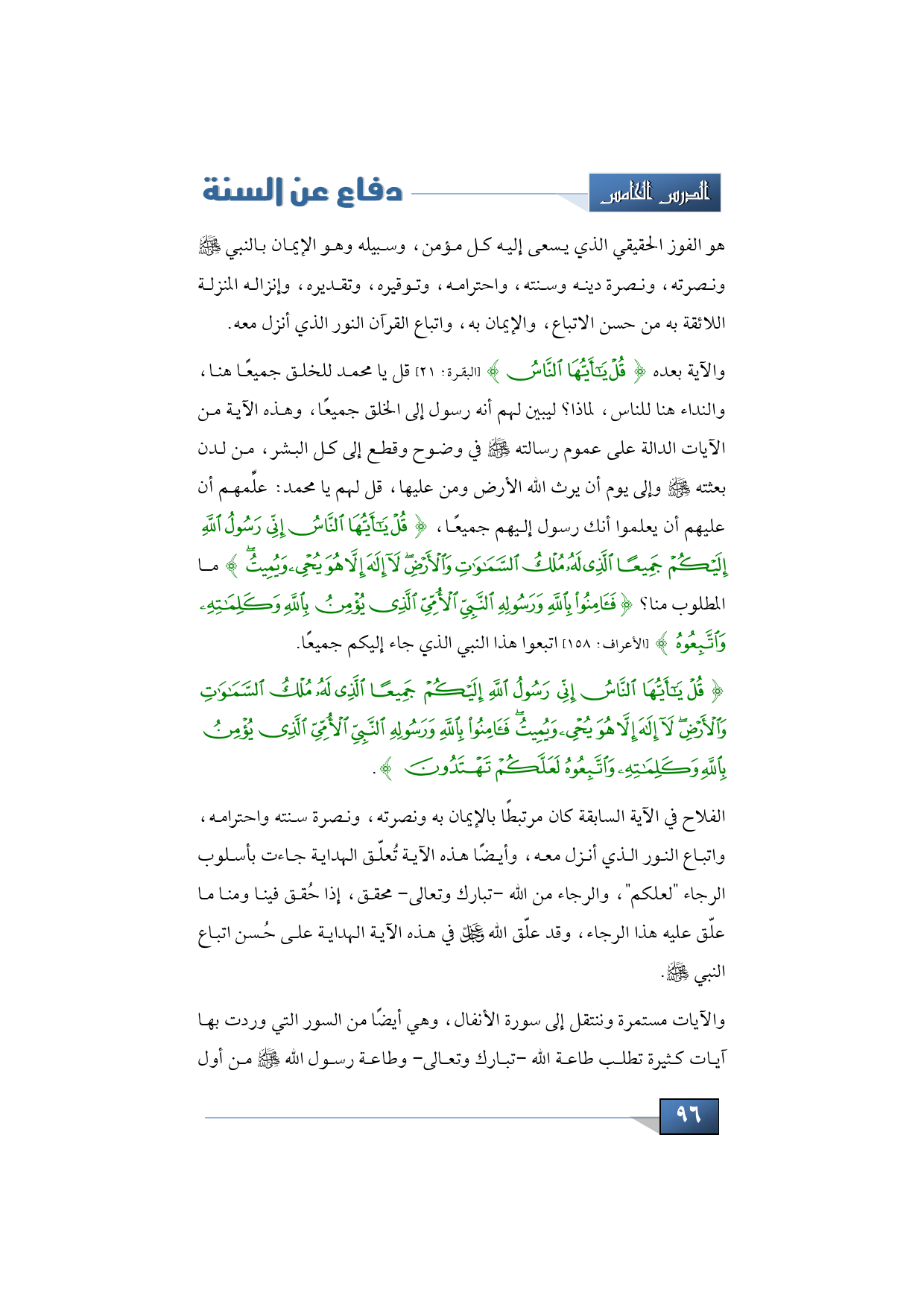 هو الفوز الحقيقي الذي يسعى إليه كل مؤمن، وسبيله وهو الإيمان بالنبي -صلى الله عليه وسلم- ونصرته، ونصرة دينه وسنته، واحترامه، وتوقيره، وتقديره، وإنزاله المنزلة اللائقة به من حسن الاتباع، والإيمان به، واتباع القرآن النور الذي أنزل معه.