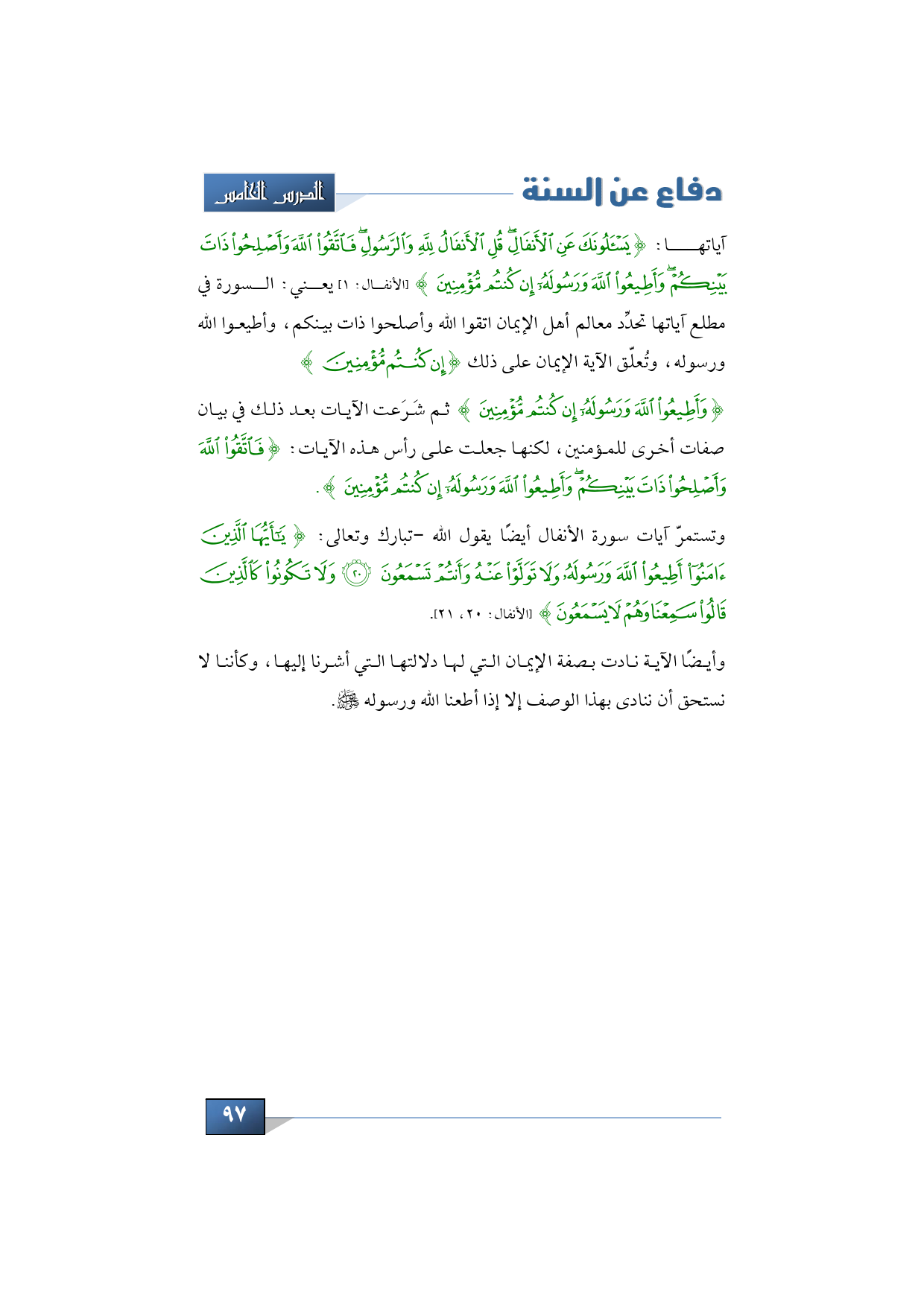 آياتها: {يَسْأَلُونَكَ عَنِ الْأَنْفَالِ قُلِ الْأَنْفَالُ لِلَّهِ وَالرَّسُولِ فَاتَّقُوا اللَّهَ وَأَصْلِحُوا ذَاتَ بَيْنِكُمْ وَأَطِيعُوا اللَّهَ وَرَسُولَهُ إِنْ كُنْتُمْ مُؤْمِنِينَ} (الأنفال: 1) يعني: السورة في مطلع آياتها تحدِّد معالم أهل الإيمان اتقوا الله وأصلحوا ذات بينكم، وأطيعوا الله ورسوله، وتُعلّق الآية الإيمان على ذلك {إِنْ كُنْتُمْ مُؤْمِنِينَ}