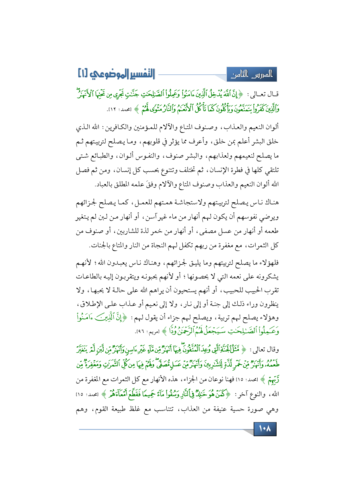 هناك ناس يصلح لتربيتهم ولاستجاشة همتهم للعمل، كما يصلح لجزائهم ويرضي نفوسهم أن يكون لهم أنهار من ماء غير آسن، أو أنهار من لبن لم يتغير طعمه أو أنهار من عسل مصفى، أو أنهار من خمر لذة للشاربين، أو صنوف من كل الثمرات، مع مغفرة من ربهم تكفل لهم النجاة من النار والمتاع بالجنات.