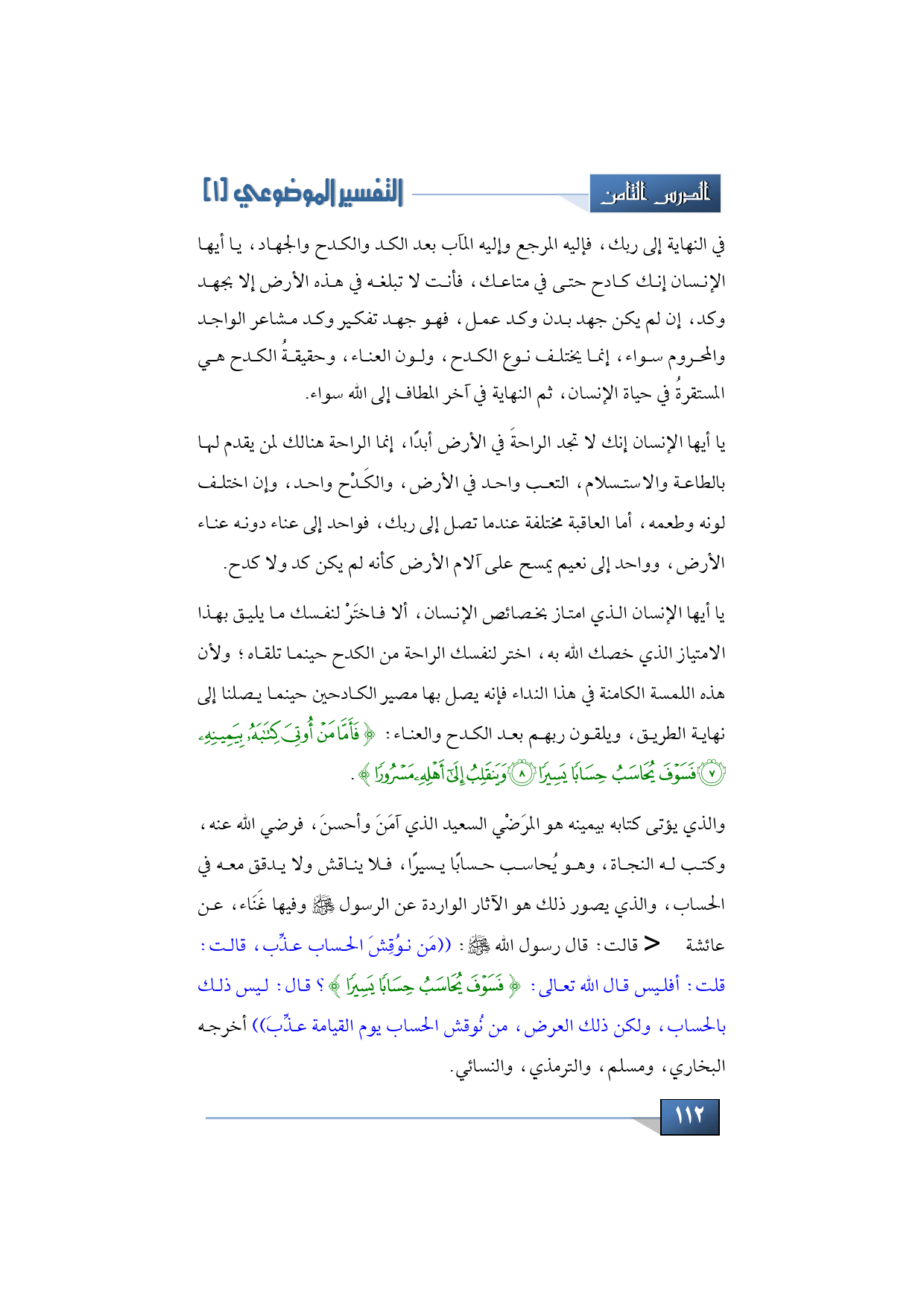 والذي يؤتى كتابه بيمينه هو المرَضْي السعيد الذي آمَنَ وأحسنَ، فرضي الله عنه، وكتب له النجاة، وهو يُحاسب حسابًا يسيرًا، فلا يناقش ولا يدقق معه في الحساب، والذي يصور ذلك هو الآثار الواردة عن الرسول -صلى الله عليه وسلم- وفيها غَنَاء، عن عائشة -رضي الله عنها- قالت: قال رسول الله -صلى الله عليه وسلم-: ((مَن نوُقِشَ الحساب عذِّب، قالت: قلت: أفليس قال الله تعالى: {فَسَوْفَ يُحَاسَبُ حِسَابًا يَسِيرًا}؟ قال: ليس ذلك بالحساب، ولكن ذلك العرض، من نُوقش الحساب يوم القيامة عذِّبَ)) أخرجه البخاري، ومسلم، والترمذي، والنسائي.