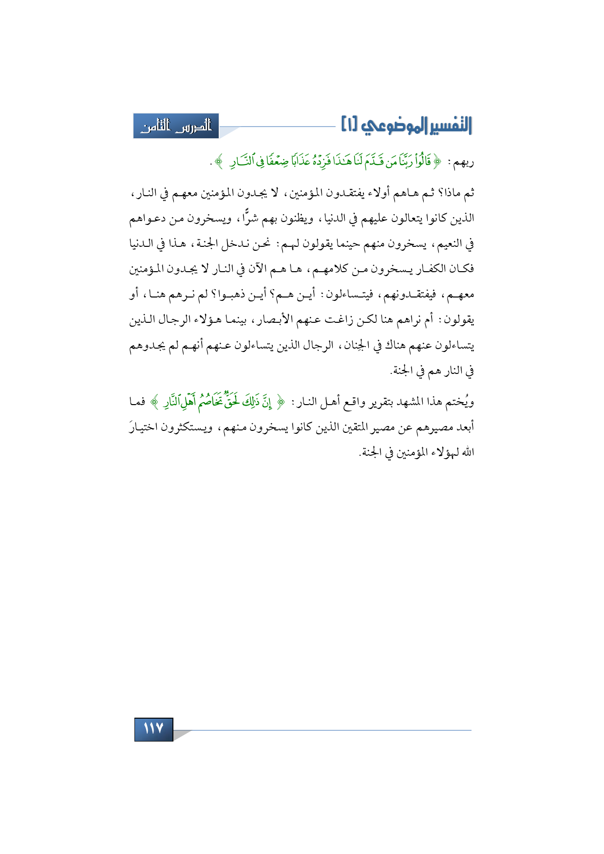 ويُختم هذا المشهد بتقرير واقع أهل النار: {إِنَّ ذَلِكَ لَحَقٌّ تَخَاصُمُ أَهْلِ النَّار} فما أبعد مصيرهم عن مصير المتقين الذين كانوا يسخرون منهم، ويستكثرون اختيارَ الله لهؤلاء المؤمنين في الجنة.