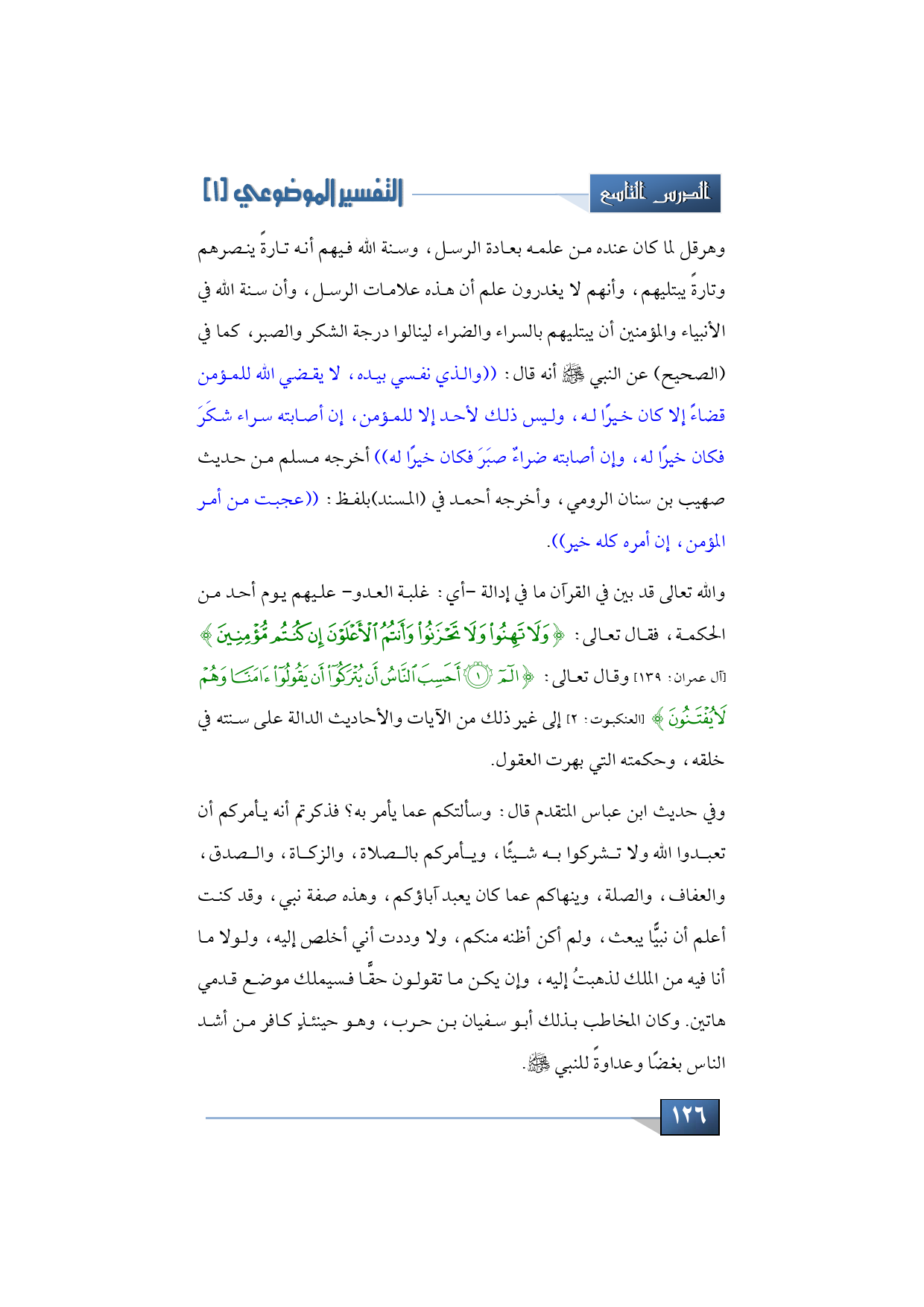 والله تعالى قد بين في القرآن ما في إدالة -أي: غلبة العدو- عليهم يوم أحد من الحكمة، فقال تعالى: {وَلَا تَهِنُوا وَلَا تَحْزَنُوا وَأَنْتُمُ الْأَعْلَوْنَ إِنْ كُنْتُمْ مُؤْمِنِينَ} (آل عمران: 139) وقال تعالى: {الم أَحَسِبَ النَّاسُ أَنْ يُتْرَكُوا أَنْ يَقُولُوا آمَنَّا وَهُمْ لَا يُفْتَنُون} (العنكبوت: 2) إلى غير ذلك من الآيات والأحاديث الدالة على سنته في خلقه، وحكمته التي بهرت العقول.