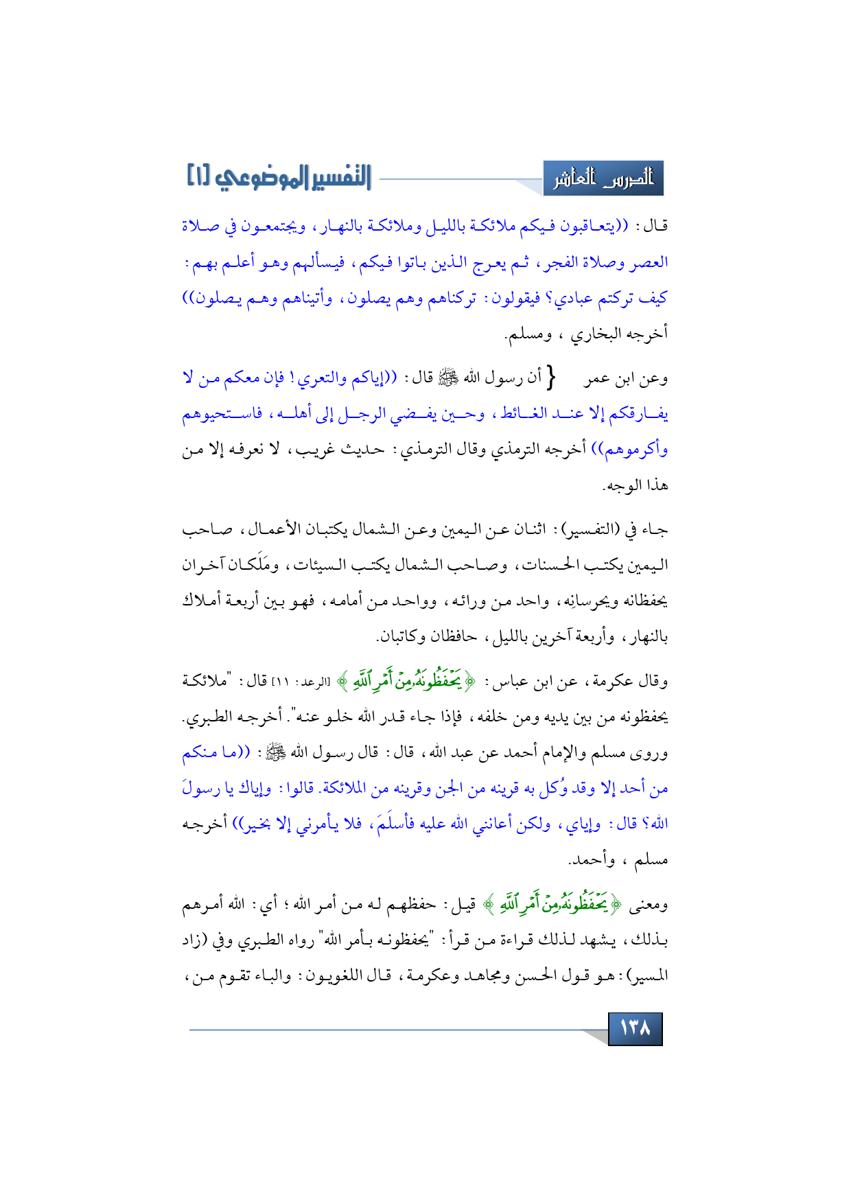 وقال عكرمة، عن ابن عباس: {يَحْفَظُونَهُ مِنْ أَمْرِ اللَّهِ} (الرعد: 11) قال: "ملائكة يحفظونه من بين يديه ومن خلفه، فإذا جاء قدر الله خلو عنه". أخرجه الطبري. وروى مسلم والإمام أحمد عن عبد الله، قال: قال رسول الله -صلى الله عليه وسلم-: ((ما منكم من أحد إلا وقد وُكل به قرينه من الجن وقرينه من الملائكة. قالوا: وإياك يا رسولَ الله؟ قال: وإياي، ولكن أعانني الله عليه فأسلَمَ، فلا يأمرني إلا بخير)) أخرجه مسلم، وأحمد.