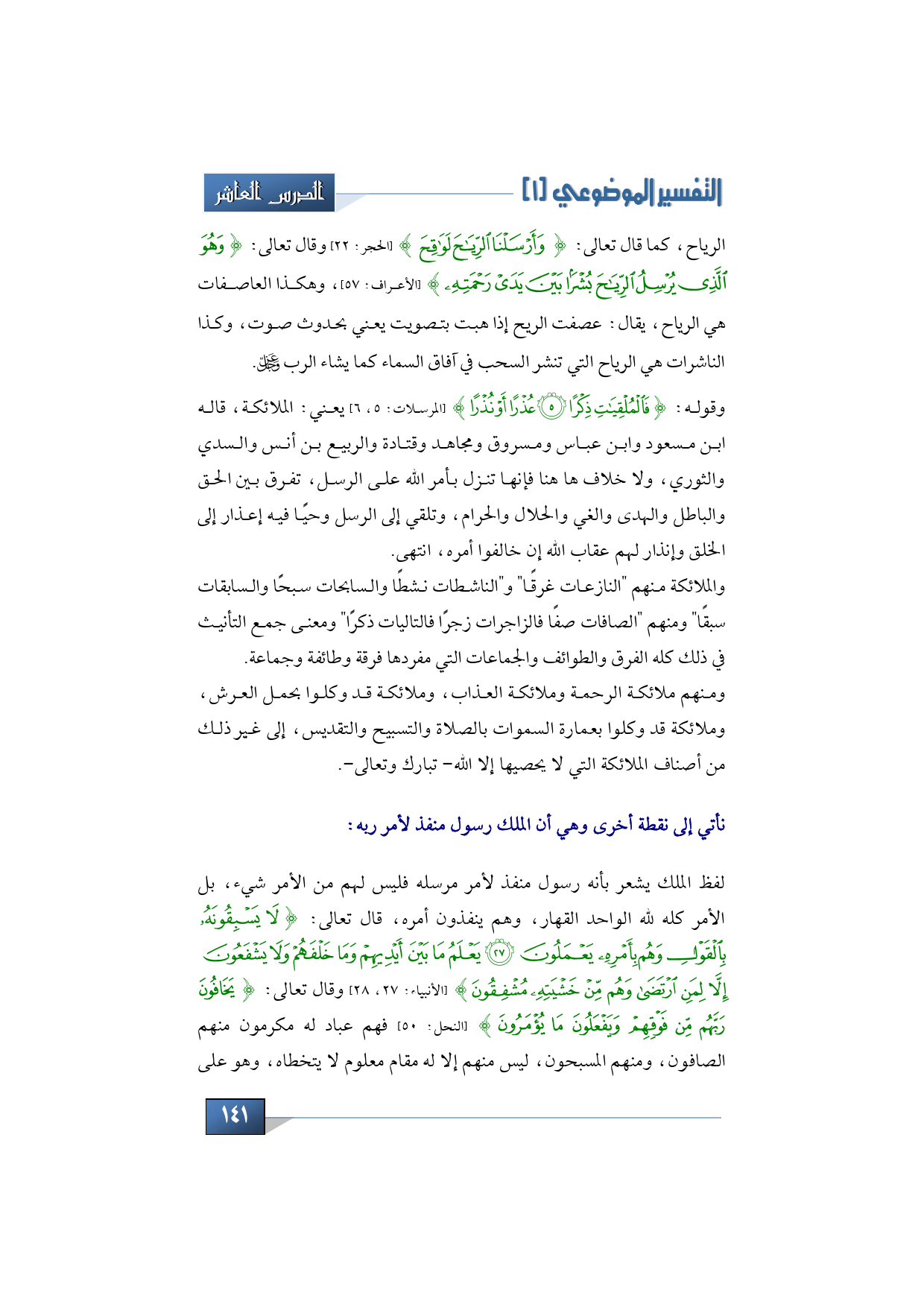 والملائكة منهم "النازعات غرقًا" و"الناشطات نشطًا والسابحات سبحًا والسابقات سبقًا" ومنهم "الصافات صفًا فالزاجرات زجرًا فالتاليات ذكرًا" ومعنى جمع التأنيث في ذلك كله الفرق والطوائف والجماعات التي مفردها فرقة وطائفة وجماعة.