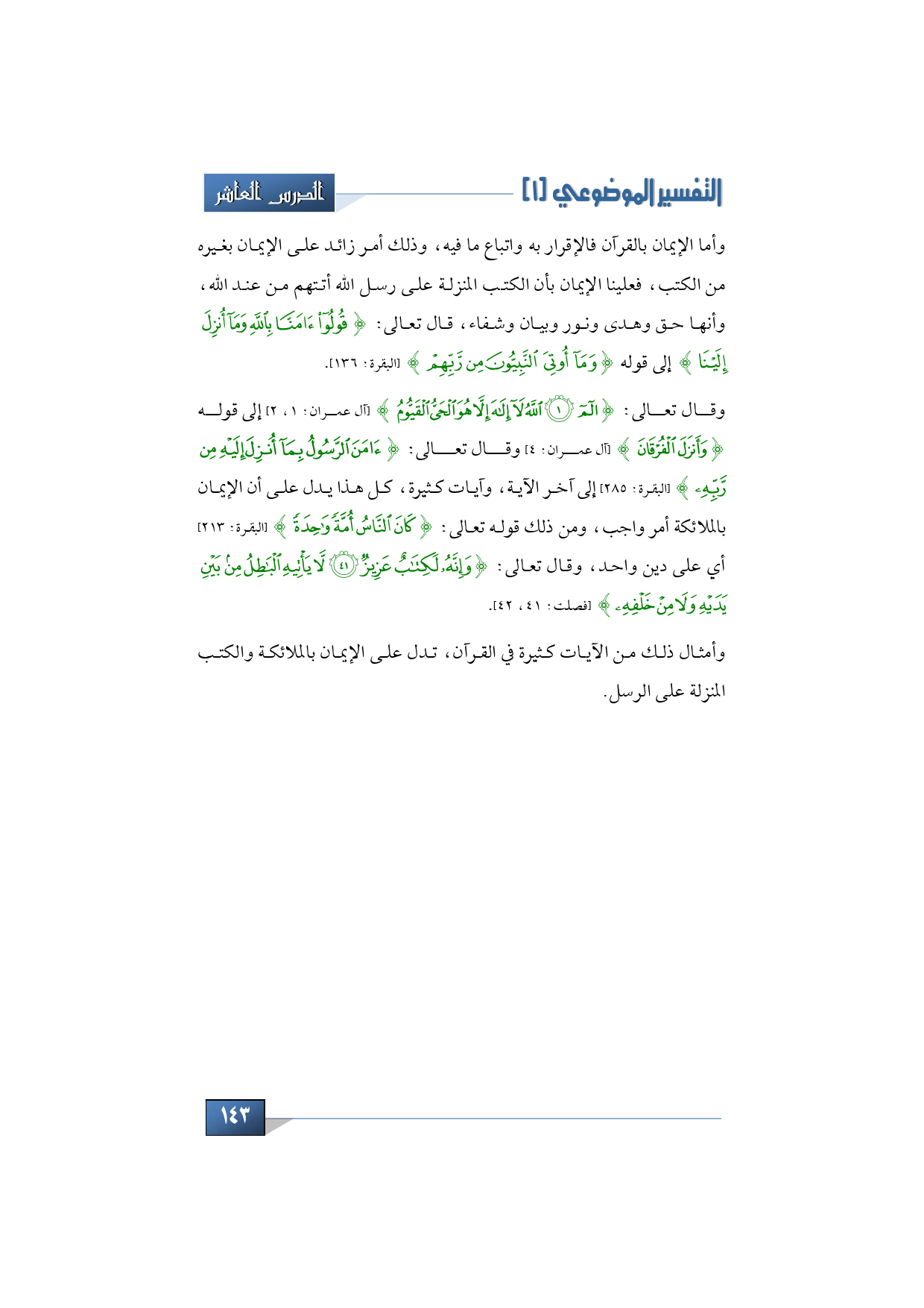 وقال تعالى: {الم * اللَّهُ لَا إِلَهَ إِلَّا هُوَ الْحَيُّ الْقَيُّوم} (آل عمران: 1، 2) إلى قوله {وَأَنْزَلَ الْفُرْقَانَ} (آل عمران: 4) وقال تعالى: {آمَنَ الرَّسُولُ بِمَا أُنْزِلَ إِلَيْهِ مِنْ رَبِّهِ} (البقرة: 285) إلى آخر الآية، وآيات كثيرة، كل هذا يدل على أن الإيمان بالملائكة أمر واجب، ومن ذلك قوله تعالى: {كَانَ النَّاسُ أُمَّةً وَاحِدَةً} (البقرة: 213) أي على دين واحد، وقال تعالى: {وَإِنَّهُ لَكِتَابٌ عَزِيزٌ لَا يَأْتِيهِ الْبَاطِلُ مِنْ بَيْنِ يَدَيْهِ وَلَا مِنْ خَلْفِهِ} (فصلت: 41، 42).