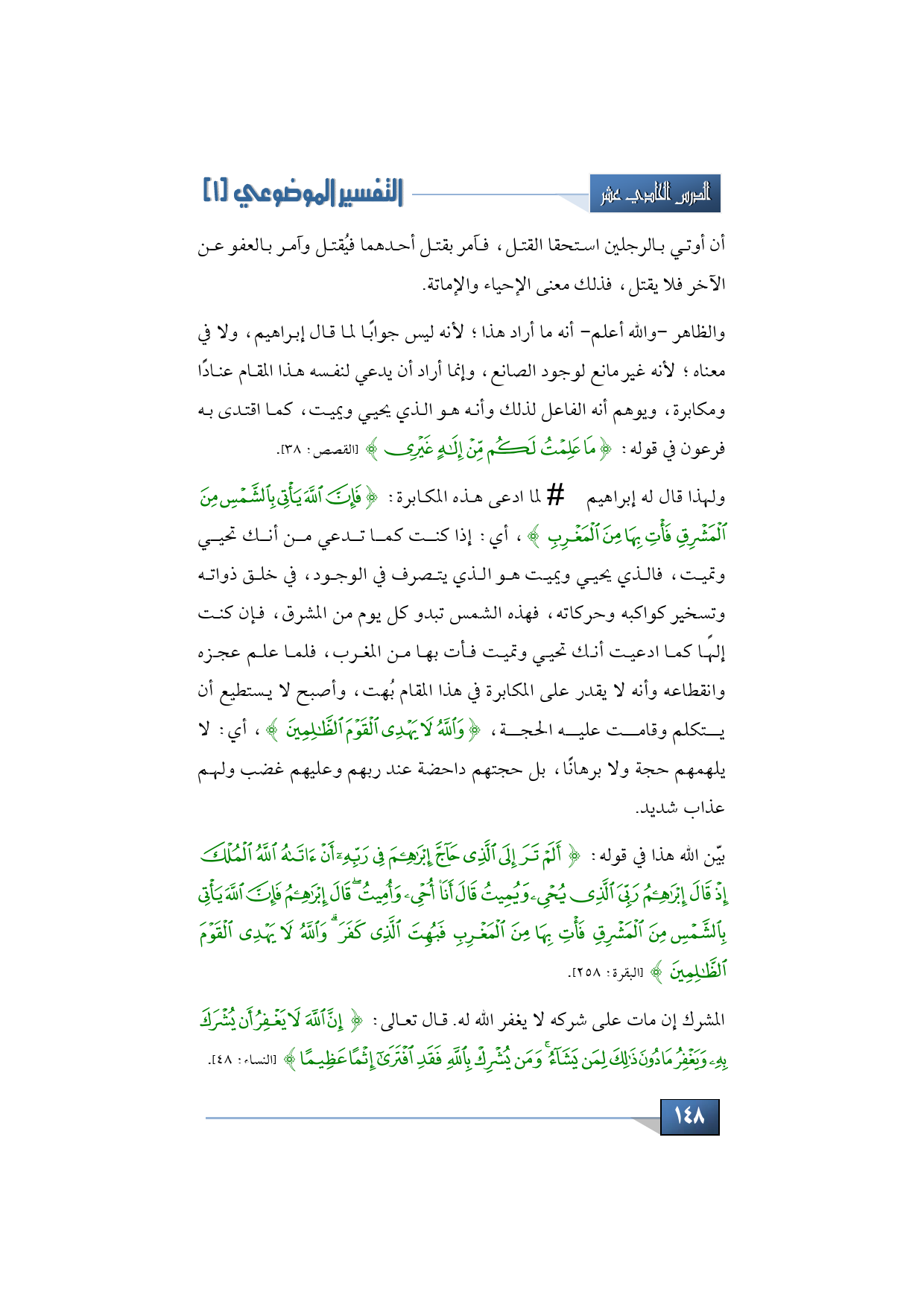 ولهذا قال له إبراهيم -عليه السلام- لما ادعى هذه المكابرة: {فَإِنَّ اللَّهَ يَأْتِي بِالشَّمْسِ مِنَ الْمَشْرِقِ فَأْتِ بِهَا مِنَ الْمَغْرِبِ}، أي: إذا كنت كما تدعي من أنك تحيي وتميت، فالذي يحيي ويميت هو الذي يتصرف في الوجود، في خلق ذواته وتسخير كواكبه وحركاته، فهذه الشمس تبدو كل يوم من المشرق، فإن كنت إلهًا كما ادعيت أنك تحيي وتميت فأت بها من المغرب، فلما علم عجزه وانقطاعه وأنه لا يقدر على المكابرة في هذا المقام بُهت، وأصبح لا يستطيع أن يتكلم وقامت عليه الحجة، {وَاللَّهُ لَا يَهْدِي الْقَوْمَ الظَّالِمِينَ}، أي: لا يلهمهم حجة ولا برهانًا، بل حجتهم داحضة عند ربهم وعليهم غضب ولهم عذاب شديد.