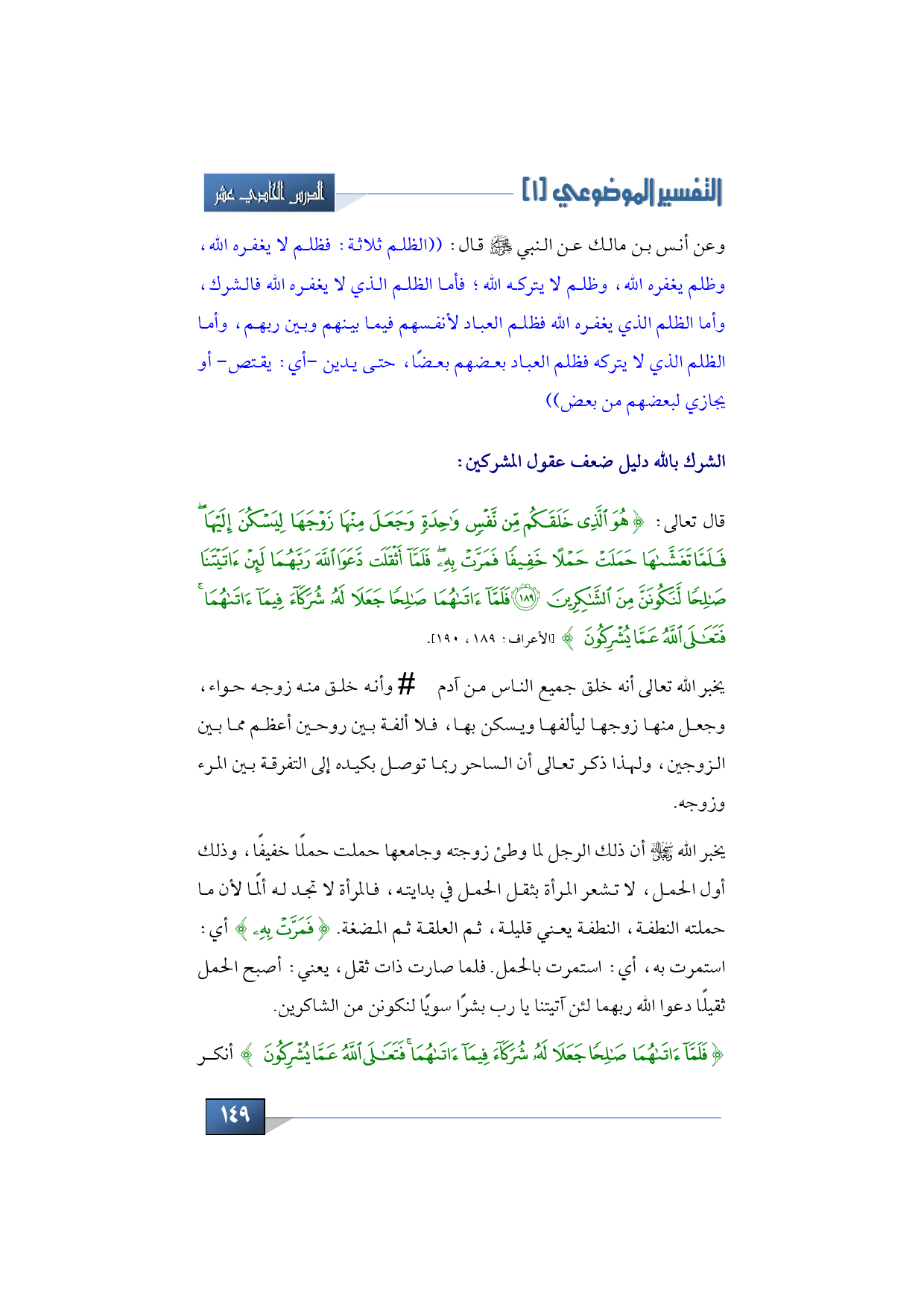 قال تعالى: {هُوَ الَّذِي خَلَقَكُمْ مِنْ نَفْسٍ وَاحِدَةٍ وَجَعَلَ مِنْهَا زَوْجَهَا لِيَسْكُنَ إِلَيْهَا فَلَمَّا تَغَشَّاهَا حَمَلَتْ حَمْلًا خَفِيفًا فَمَرَّتْ بِهِ فَلَمَّا أَثْقَلَتْ دَعَوَا اللَّهَ رَبَّهُمَا لَئِنْ آتَيْتَنَا صَالِحًا لَنَكُونَنَّ مِنَ الشَّاكِرِينَ * فَلَمَّا آتَاهُمَا صَالِحًا جَعَلَا لَهُ شُرَكَاءَ فِيمَا آتَاهُمَا فَتَعَالَى اللَّهُ عَمَّا يُشْرِكُونَ} (الأعراف: 189، 190).