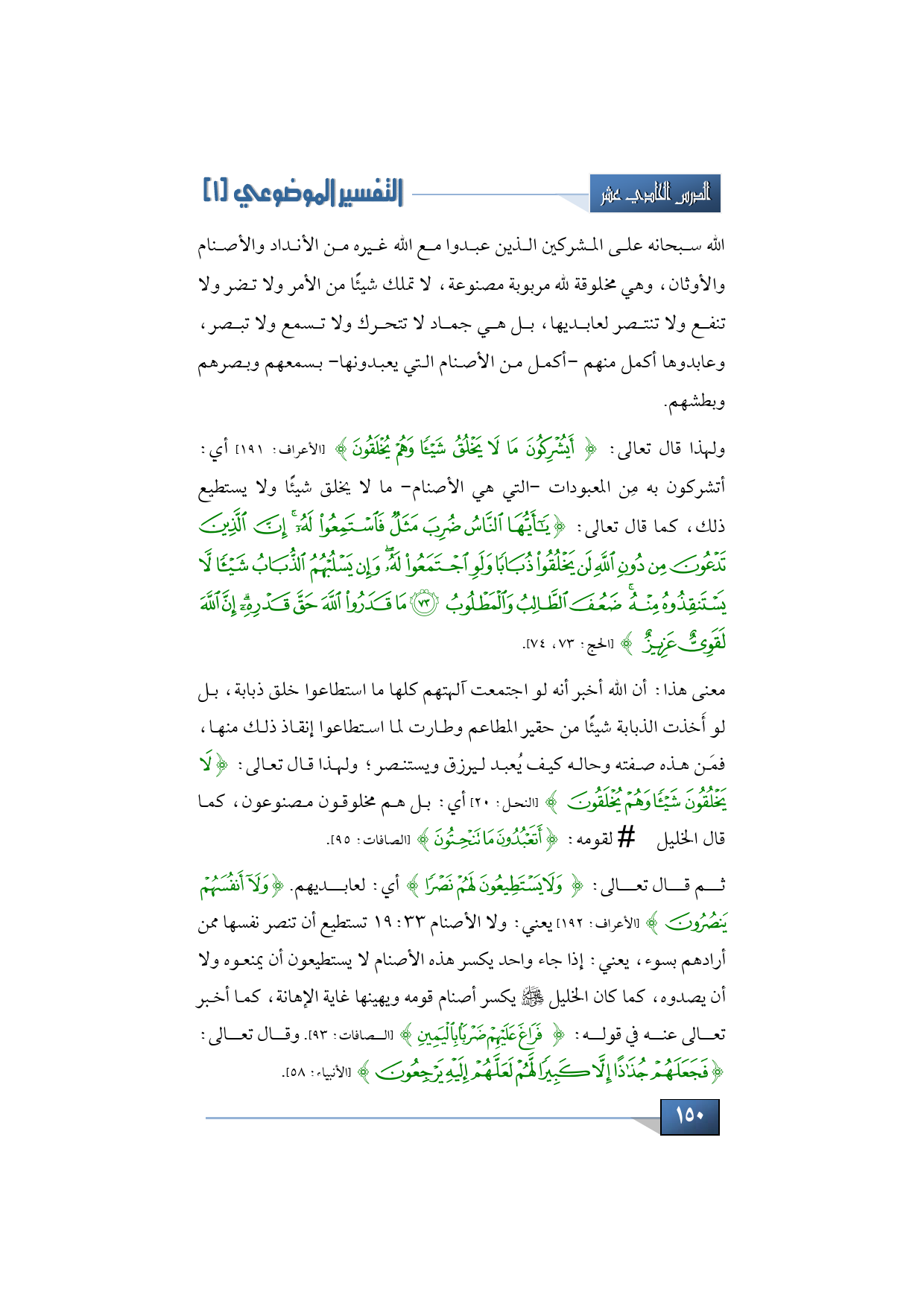 الله سبحانه على المشركين الذين عبدوا مع الله غيره من الأنداد والأصنام والأوثان، وهي مخلوقة لله مربوبة مصنوعة، لا تملك شيئًا من الأمر ولا تضر ولا تنفع ولا تنتصر لعابديها، بل هي جماد لا تتحرك ولا تسمع ولا تبصر، وعابدوها أكمل منهم -أكمل من الأصنام التي يعبدونها- بسمعهم وبصرهم وبطشهم.