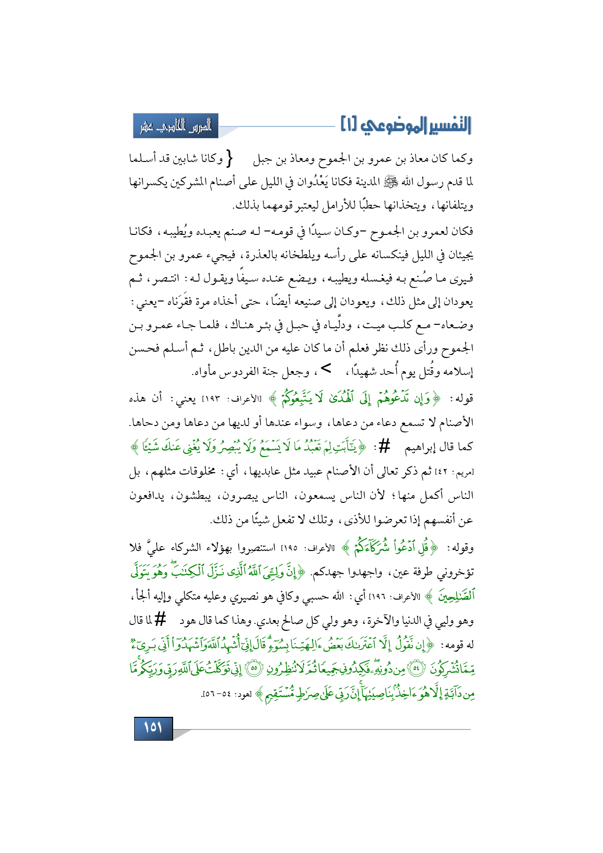 فكان لعمرو بن الجموح -وكان سيدًا في قومه- له صنم يعبده ويُطيبه، فكانا يجيئان في الليل فينكسانه على رأسه ويلطخانه بالعذرة، فيجيء عمرو بن الجموح فيرى ما صُنع به فيغسله ويطيبه، ويضع عنده سيفًا ويقول له: انتصر، ثم يعودان إلى مثل ذلك، ويعودان إلى صنيعه أيضًا، حتى أخذاه مرة فقَرَناه -يعني: وضعاه- مع كلب ميت، ودلَّياه في حبل في بئر هناك، فلما جاء عمرو بن الجموح ورأى ذلك نظر فعلم أن ما كان عليه من الدين باطل، ثم أسلم فحسن إسلامه وقُتل يوم أُحد شهيدًا، رضي الله عنه وأرضاه، وجعل جنة الفردوس مأواه.