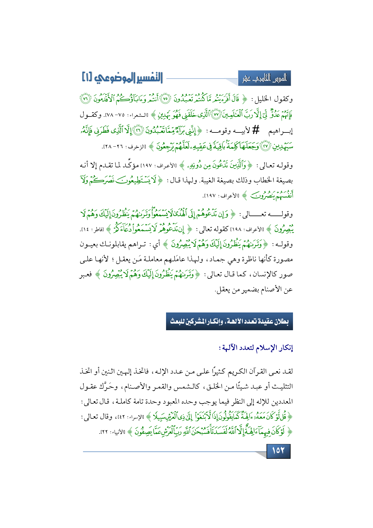 وقوله تعالى: {وَإِنْ تَدْعُوهُمْ إِلَى الْهُدَى لَا يَسْمَعُوا وَتَرَاهُمْ يَنْظُرُونَ إِلَيْكَ وَهُمْ لَا يُبْصِرُونَ} (الأعراف: 198) كقوله تعالى: {إِنْ تَدْعُوهُمْ لَا يَسْمَعُوا دُعَاءَكُمْ} (فاطر: 14). وقوله: {وَتَرَاهُمْ يَنْظُرُونَ إِلَيْكَ وَهُمْ لَا يُبْصِرُونَ} أي: تراهم يقابلونك بعيون مصورة كأنها ناظرة وهي جماد، ولهذا عامَلهم معاملة مَن يعقل؛ لأنها على صور كالإنسان، كما قال تعالى: {وَتَرَاهُمْ يَنْظُرُونَ إِلَيْكَ وَهُمْ لَا يُبْصِرُونَ} فعبر عن الأصنام بضمير من يعقل.