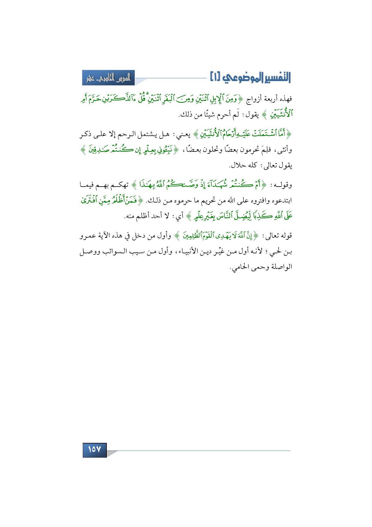 قوله تعالى: {إِنَّ اللَّهَ لَا يَهْدِي الْقَوْمَ الظَّالِمِينَ} وأول من دخل في هذه الآية عمرو بن لحي؛ لأنه أول من غيّر دين الأنبياء، وأول من سيب السوائب ووصل الواصلة وحمى الحامي.