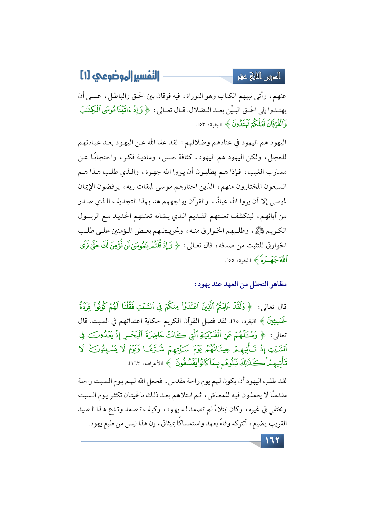 لقد طلب اليهود أن يكون لهم يوم راحة مقدس، فجعل الله لهم يوم السبت راحة مقدسًا لا يعملون فيه للمعاش، ثم ابتلاهم بعد ذلك بالحيتان تكثر يوم السبت وتختفي في غيره، وكان ابتلاءً لم تصمد له يهود، وكيف تصمد وتدع هذا الصيد القريب يضيع، أتتركه وفاءً بعهد واستمساكًا بميثاق، إن هذا ليس من طبع يهود.