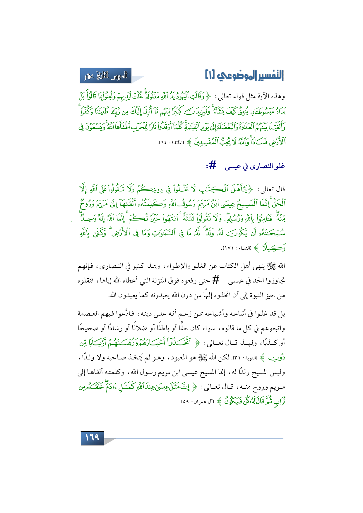 قال تعالى: {يَا أَهْل الْكِتَابِ لَا تَغْلُوا فِي دِينِكُمْ وَلَا تَقُولُوا عَلَى اللَّهِ إِلَّا الْحَقَّ إِنَّمَا الْمَسِيحُ عِيسَى ابْنُ مَرْيَمَ رَسُولُ اللَّهِ وَكَلِمَتُهُ أَلْقَاهَا إِلَى مَرْيَمَ وَرُوحٌ مِنْهُ فَآمِنُوا بِاللَّهِ وَرُسُلِهِ وَلَا تَقُولُوا ثَلَاثَةٌ انْتَهُوا خَيْرًا لَكُمْ إِنَّمَا اللَّهُ إِلَهٌ وَاحِدٌ سُبْحَانَهُ أَنْ يَكُونَ لَهُ وَلَدٌ لَهُ مَا فِي السَّمَاوَاتِ وَمَا فِي الْأَرْضِ وَكَفَى بِاللَّهِ وَكِيلًا} (النساء: 171).