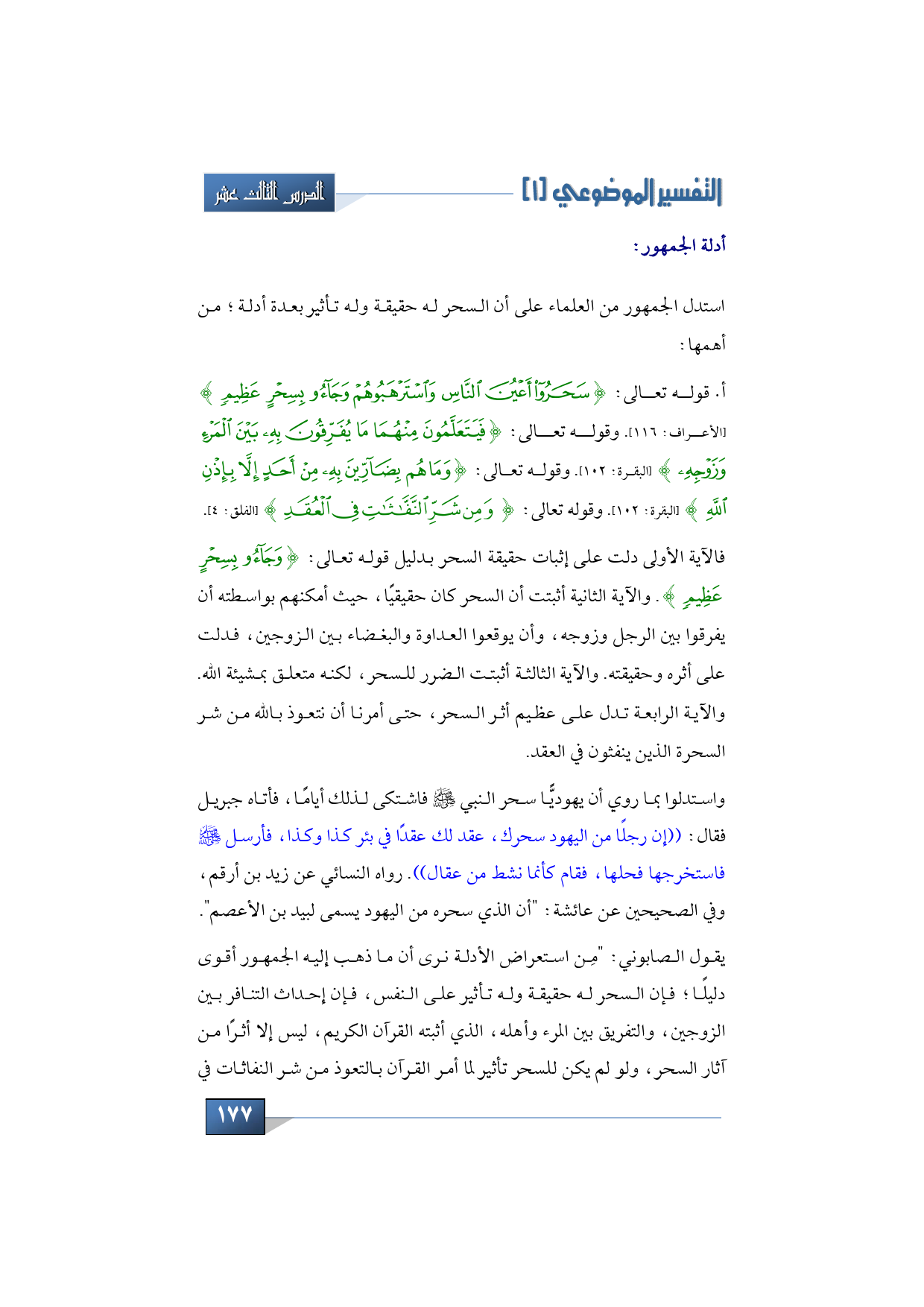 يقول الصابوني: "مِن استعراض الأدلة نرى أن ما ذهب إليه الجمهور أقوى دليلًا؛ فإن السحر له حقيقة وله تأثير على النفس، فإن إحداث التنافر بين الزوجين، والتفريق بين المرء وأهله، الذي أثبته القرآن الكريم، ليس إلا أثرًا من آثار السحر، ولو لم يكن للسحر تأثير لما أمر القرآن بالتعوذ من شر النفاثات في