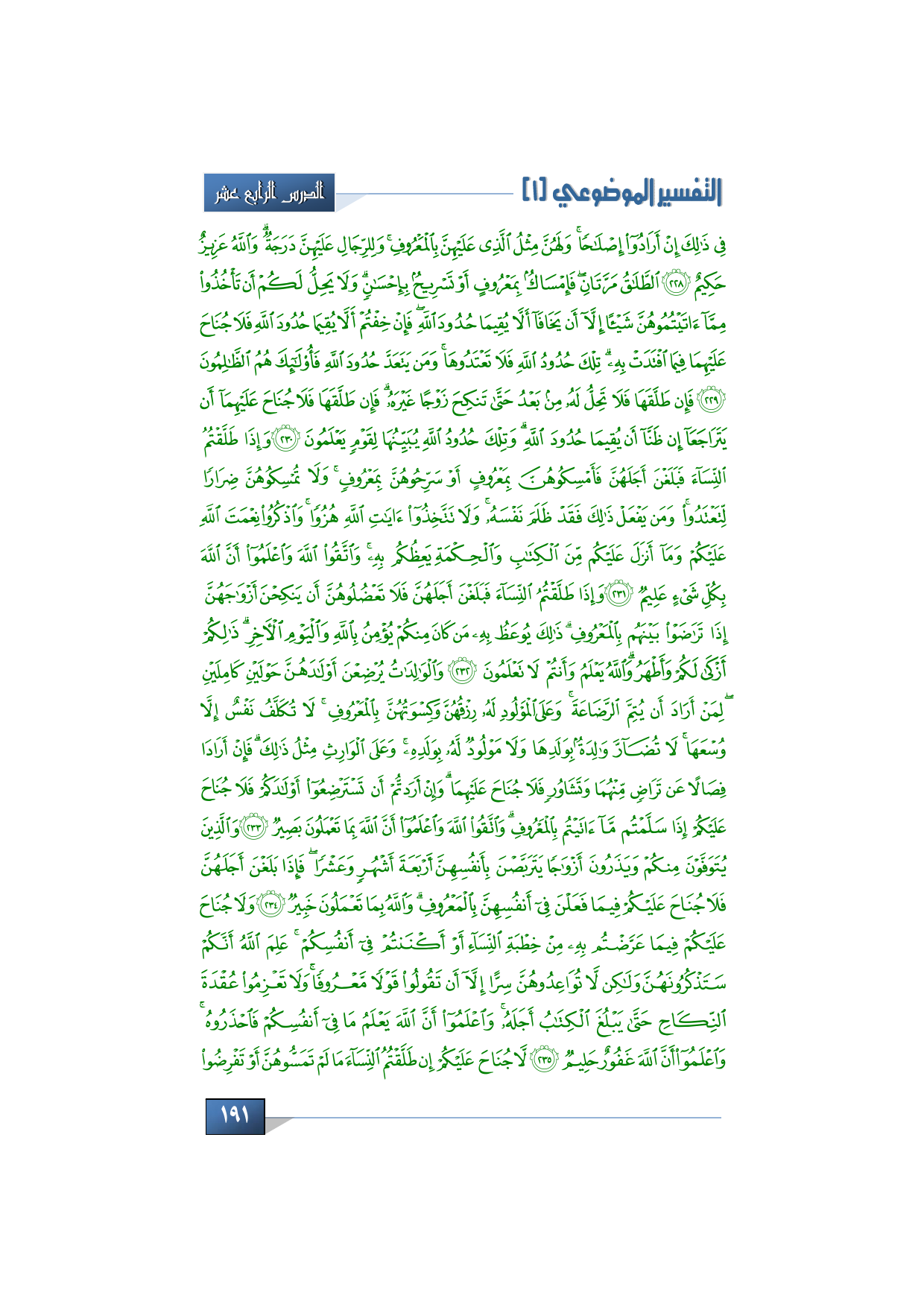 فِي ذَلِكَ إِنْ أَرَادُوا إِصْلَاحًا وَلَهُنَّ مِثْلُ الَّذِي عَلَيْهِنَّ بِالْمَعْرُوفِ وَلِلرِّجَالِ عَلَيْهِنَّ دَرَجَةٌ وَاللَّهُ عَزِيزٌ حَكِيمٌ * الطَّلَاقُ مَرَّتَانِ فَإِمْسَاكٌ بِمَعْرُوفٍ أَوْ تَسْرِيحٌ بِإِحْسَانٍ وَلَا يَحِلُّ لَكُمْ أَنْ تَأْخُذُوا مِمَّا آتَيْتُمُوهُنَّ شَيْئًا إِلَّا أَنْ يَخَافَا أَلَّا يُقِيمَا حُدُودَ اللَّهِ فَإِنْ خِفْتُمْ أَلَّا يُقِيمَا حُدُودَ اللَّهِ فَلَا جُنَاحَ عَلَيْهِمَا فِيمَا افْتَدَتْ بِهِ تِلْكَ حُدُودُ اللَّهِ فَلَا تَعْتَدُوهَا وَمَنْ يَتَعَدَّ حُدُودَ اللَّهِ فَأُولَئِكَ هُمُ الظَّالِمُونَ * فَإِنْ طَلَّقَهَا فَلَا تَحِلُّ لَهُ مِنْ بَعْدُ حَتَّى تَنْكِحَ زَوْجًا غَيْرَهُ فَإِنْ طَلَّقَهَا فَلَا جُنَاحَ عَلَيْهِمَا أَنْ يَتَرَاجَعَا إِنْ ظَنَّا أَنْ يُقِيمَا حُدُودَ اللَّهِ وَتِلْكَ حُدُودُ اللَّهِ يُبَيِّنُهَا لِقَوْمٍ يَعْلَمُونَ * وَإِذَا طَلَّقْتُمُ النِّسَاءَ فَبَلَغْنَ أَجَلَهُنَّ فَأَمْسِكُوهُنَّ بِمَعْرُوفٍ أَوْ سَرِّحُوهُنَّ بِمَعْرُوفٍ وَلَا تُمْسِكُوهُنَّ ضِرَارًا لِتَعْتَدُوا وَمَنْ يَفْعَلْ ذَلِكَ فَقَدْ ظَلَمَ نَفْسَهُ وَلَا تَتَّخِذُوا آيَاتِ اللَّهِ هُزُوًا وَاذْكُرُوا نِعْمَةَ اللَّهِ عَلَيْكُمْ وَمَا أَنْزَلَ عَلَيْكُمْ مِنَ الْكِتَابِ وَالْحِكْمَةِ يَعِظُكُمْ بِهِ وَاتَّقُوا اللَّهَ وَاعْلَمُوا أَنَّ اللَّهَ بِكُلِّ شَيْءٍ عَلِيمٌ * وَإِذَا طَلَّقْتُمُ النِّسَاءَ فَبَلَغْنَ أَجَلَهُنَّ فَلَا تَعْضُلُوهُنَّ أَنْ يَنْكِحْنَ أَزْوَاجَهُنَّ إِذَا تَرَاضَوْا بَيْنَهُمْ بِالْمَعْرُوفِ ذَلِكَ يُوعَظُ بِهِ مَنْ كَانَ مِنْكُمْ يُؤْمِنُ بِاللَّهِ وَالْيَوْمِ الْآخِرِ ذَلِكُمْ أَزْكَى لَكُمْ وَأَطْهَرُ وَاللَّهُ يَعْلَمُ وَأَنْتُمْ لَا تَعْلَمُونَ * وَالْوَالِدَاتُ يُرْضِعْنَ أَوْلَادَهُنَّ حَوْلَيْنِ كَامِلَيْنِ لِمَنْ أَرَادَ أَنْ يُتِمَّ الرَّضَاعَةَ وَعَلَى الْمَوْلُودِ لَهُ رِزْقُهُنَّ وَكِسْوَتُهُنَّ بِالْمَعْرُوفِ لَا تُكَلَّفُ نَفْسٌ إِلَّا وُسْعَهَا لَا تُضَارَّ وَالِدَةٌ بِوَلَدِهَا وَلَا مَوْلُودٌ لَهُ بِوَلَدِهِ وَعَلَى الْوَارِثِ مِثْلُ ذَلِكَ فَإِنْ أَرَادَا فِصَالًا عَنْ تَرَاضٍ مِنْهُمَا وَتَشَاوُرٍ فَلَا جُنَاحَ عَلَيْهِمَا وَإِنْ أَرَدْتُمْ أَنْ تَسْتَرْضِعُوا أَوْلَادَكُمْ فَلَا